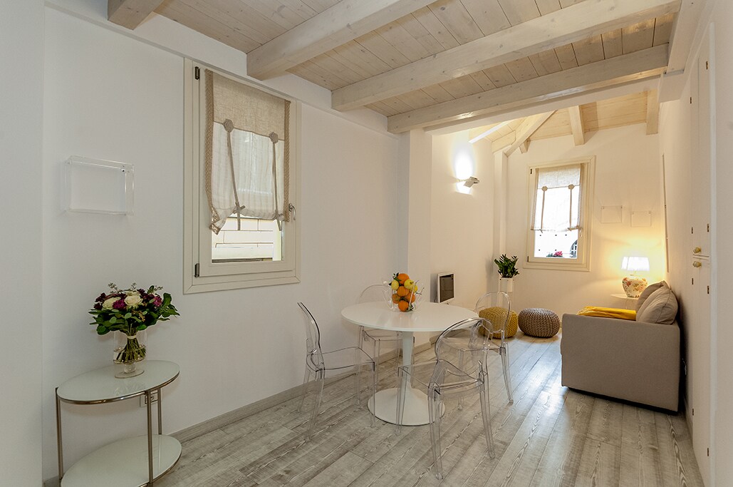 Mərkəzdə yerləşən mənzildə ayrıca hamam otağı olan otaq – lakin məhdud hərəkət zonasından (ZTL) kənarda – tam təmirli, işıqlı və xoş qonaqlama üçün lazım olan hər şeylə təchiz edilmiş otaq. Otağa üçkünc çarpayı, qarderob, masa, rəflər və çəkməcələr daxildir. Əvvəlcədən bron etməklə böyük qaraj mövcud ola bilər.