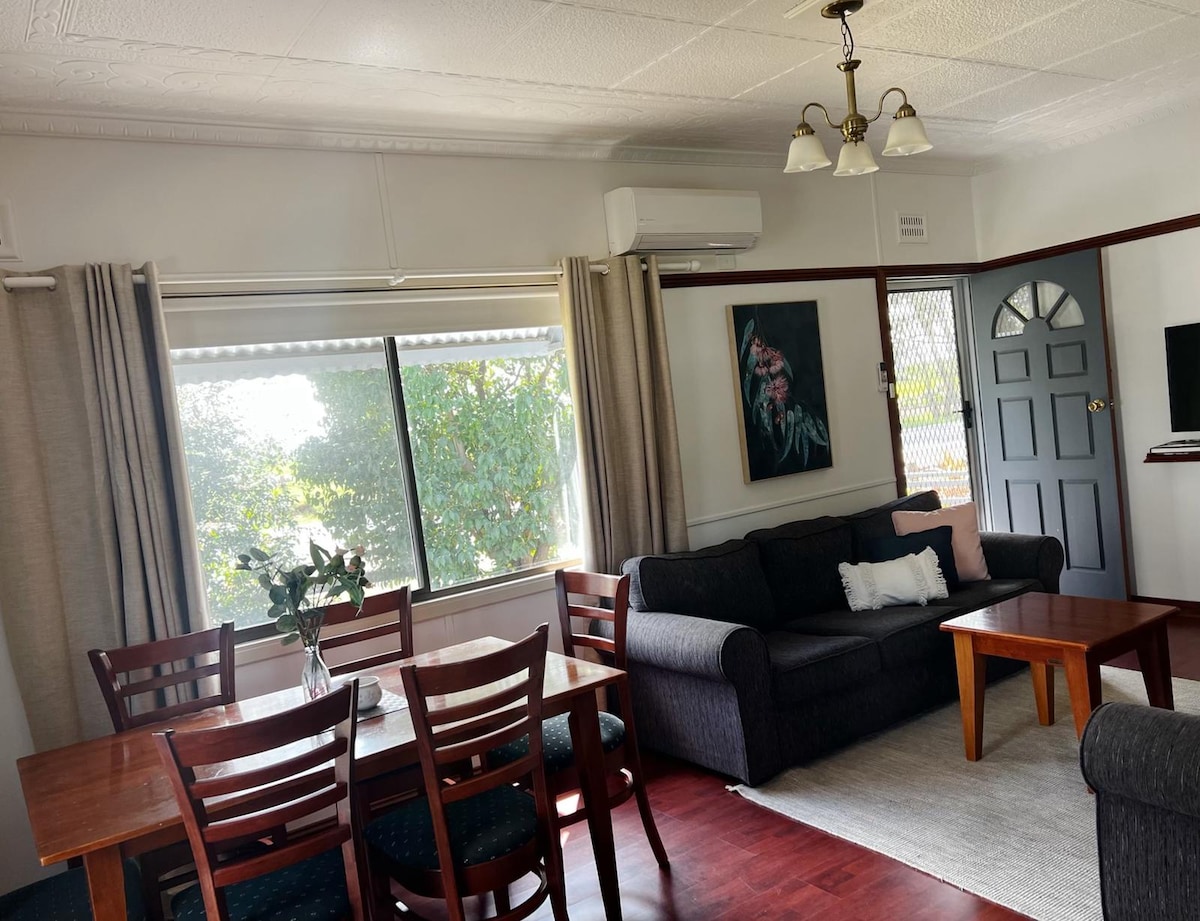 Newly Renovated Interior. Lge Main Bedroom with King Bed, a 42"TV and Workspace. A Queen Bedroom & Bunk Bedroom. Ample Robe Space. Sleeps 6. Fully Appointed, Functional Kitchen & Laundry. Super Comfy Lounge, 60" TV. Free WI FI & Netflix. Split Air Con, Fans in Bedrooms & Living. Relax on Front Porch, Entertain Undercover in the Lge Secure Backyard. 1km, CBD and Restaurant Hotel Cafe precinct. 1km to Wod. Plaza, Sumsion Gardens & Playground, and Wod. Tennis Centre. Children welcome. Dogs also :)