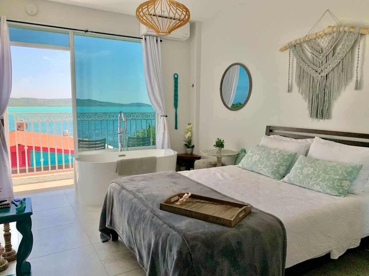 Habitación con vista a la bahía de Boquerón en el corazón del Poblado. La habitación está ubicada en un tercer piso lo cual permite una vista privilegiada al mar y al poblado en general. Cuenta con una tina para mayor disfrute de nuestra espectacular vista. Room with a great view of Boquerón bay in the heart of the town. The room is located on the third floor which allows a privileged view of the sea and the town. It has a bath tub for greater enjoyment of our spectacular view.