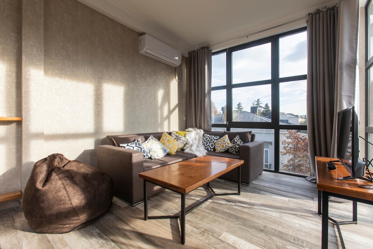 Tiflisin ən qaynar yerində, 5 ulduzlu otellərlə əhatə olunmuş qonaqlamanızdan zövq alın: Biltmore, Radisson, Stamba və Rooms və Rustaveli metro stansiyasından və bütün əsas görməli yerlərdən cəmi bir neçə addımlıq məsafədə. 1930-cu illərdə daşdan inşa edilmiş binanın ən üst mərtəbəsində yerləşən, özəl terrası və gözəl mənzərəsi olan vintaj loftda qonaqlayacaqsınız. Yerdən tavana qədər olan pəncərələr hər otaqdan bol günəş işığı, təbii işıq və gözəl mənzərələr təmin edir, lakin gündüz yuxusu gələnlər üçün ağır pərdələr də var:)