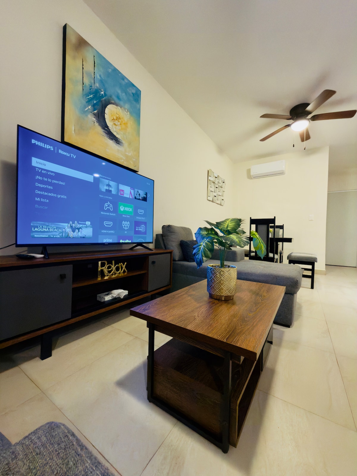 Rahat mənzil, xoş qonaqlama üçün lazım olan hər şeyin olduğu açıq məkan. Kiçik, lakin funksional mətbəx, yemək otağı, ikinəfərlik çarpayı, divan çarpayı, 1 tam hamam, ütü, soba, soyuducu, anbar, mikrodalğalı soba, blender, qəhvə maşını, qab-qacaq, qazan, minisplit, Smart TV, wi-fi, qeyri-adi ventilyator və Müstəqil Giriş Tampiko hava limanından 6-8 dəqiqəlik məsafədə yerləşən Tampico- Mante yolundan iki yarım blok.