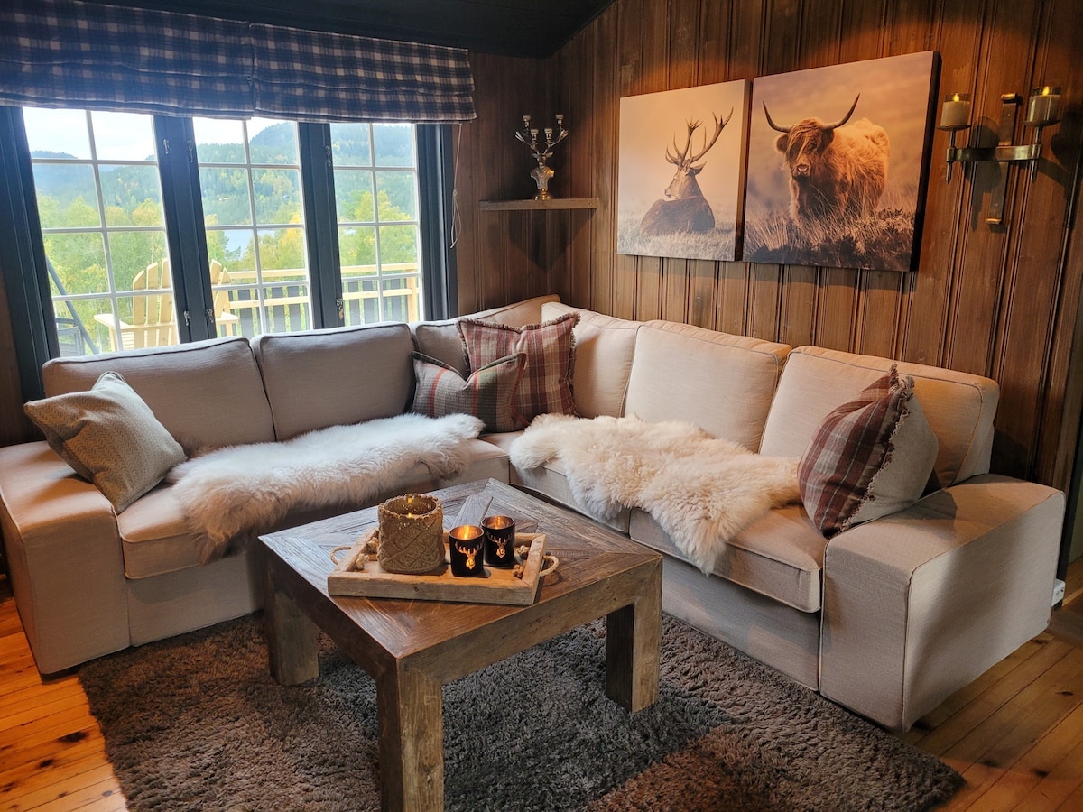 Moderne hytte fra 2021 med panoramavinduer fra gulv til tak som åpner hytten mot en spektakulær utsikt. Utsikten endrer seg med årstiden. På sommeren beiter sauene rundt hytten og er du heldig kommer det en hare hoppende. På vinteren er det ski inn/ut. Hytten har både varmepumpe og peis som gir en lun stemning. Den romslige loftstuen med TV, Lego og spill er perfekt for barna. Hytten passer perfekt for to familier. Er dere bare voksne anbefales maks 8 personer.