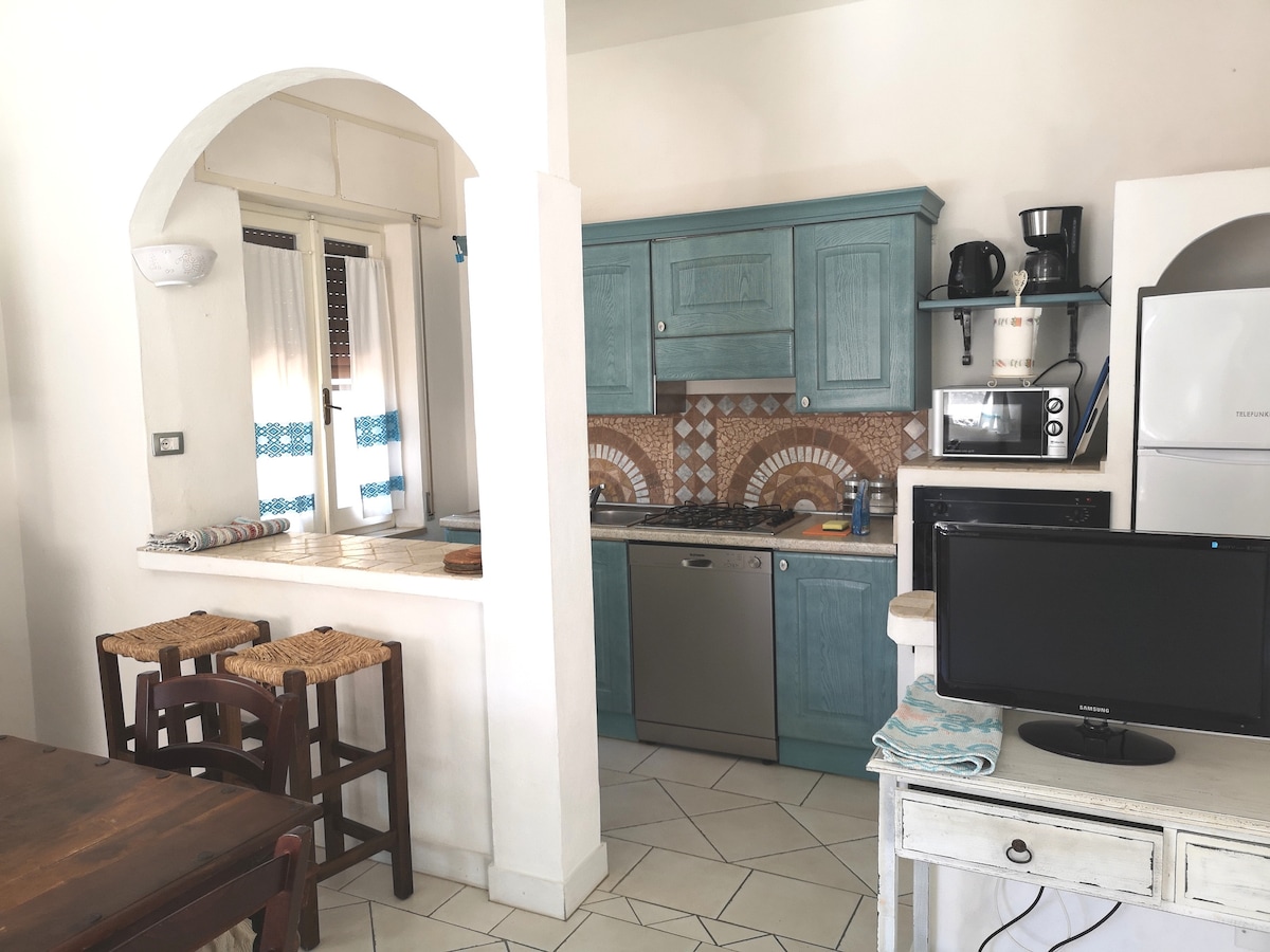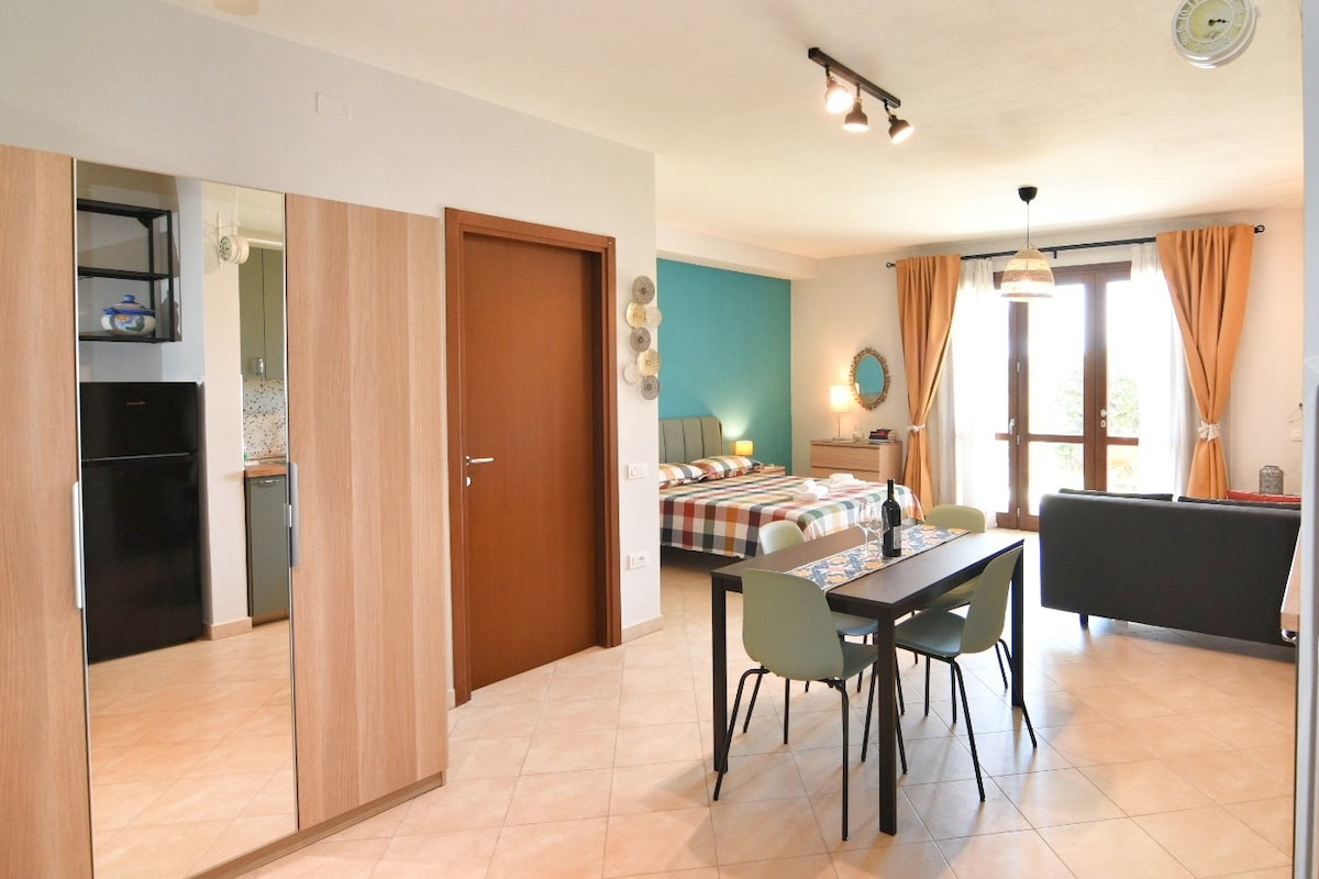 Bosa Marina çimərliyindən cəmi bir neçə dəqiqəlik məsafədə parlaq və rahat yeni tikilmiş mənzil. Xüsusilə geniş studiya rahat qonaqlamanı təmin etmək üçün bütün komfortları təklif edir: ikinəfərlik çarpayı, divan çarpayı, oxu sahəsi, masa və böyük mətbəx; kondisioner, televizor və wi-fi. Sakit, yaşıllıqlarla əhatə olunmuş sakit yer: böyük örtülü veranda, eksklüziv istifadə üçün bağ, əmlakın içində rezervasiya edilmiş parkinq.