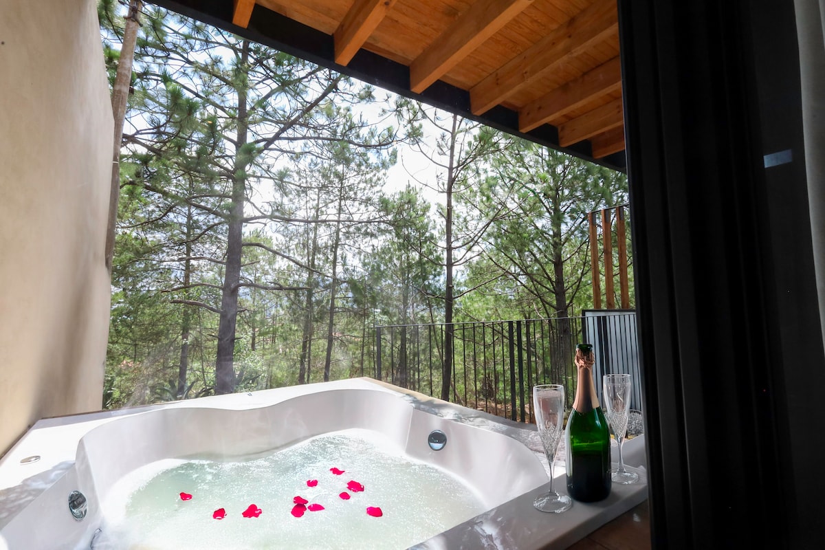 Relájate en este espacio tan tranquilo y elegante, Disfruta del encantador entorno de esta romántica Cabaña Prieta. Se encuentra ubicado a 5 km de la plaza principal, esta rodeada de enormes pinos, cuenta con acabados de lujo, Cocina equipada, Jacuzzi, Terraza con vista Panoramica, TV con sistema Dish. Todo lo necesario para que pases un agradable noche con tu pareja en la naturaleza.