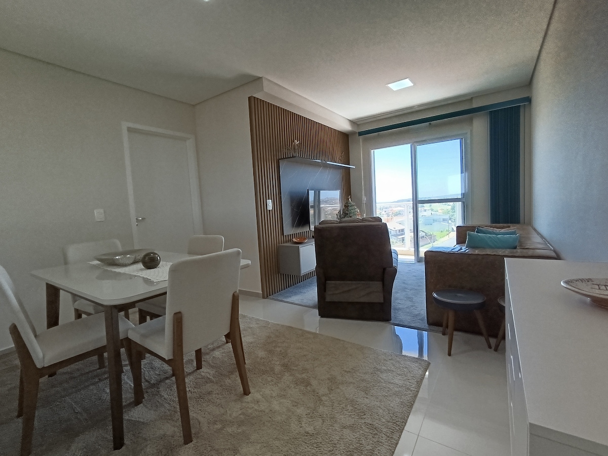 Apartamento 3 quartos, conta, 1 quarto com cama de casal, tv a cabo e suíte. 1 quarto com sofá cama com mesa e cadeira de escritório, ideal para home office. 1 quartos com uma bicama para 2 pessoas e armário completo. Ar condicionado na Suíte e na Sala. Demais ventilador portátil. Sala com mesa de jantar, tv smart, cozinha completa e área de serviço com máquina de lavar, tábua de passar roupa e varal. disponibilizamos roupa de cama, banho e ferro de passar. DISPONÍVEL 2 VAGAS DE GARAGEM COBERTAS