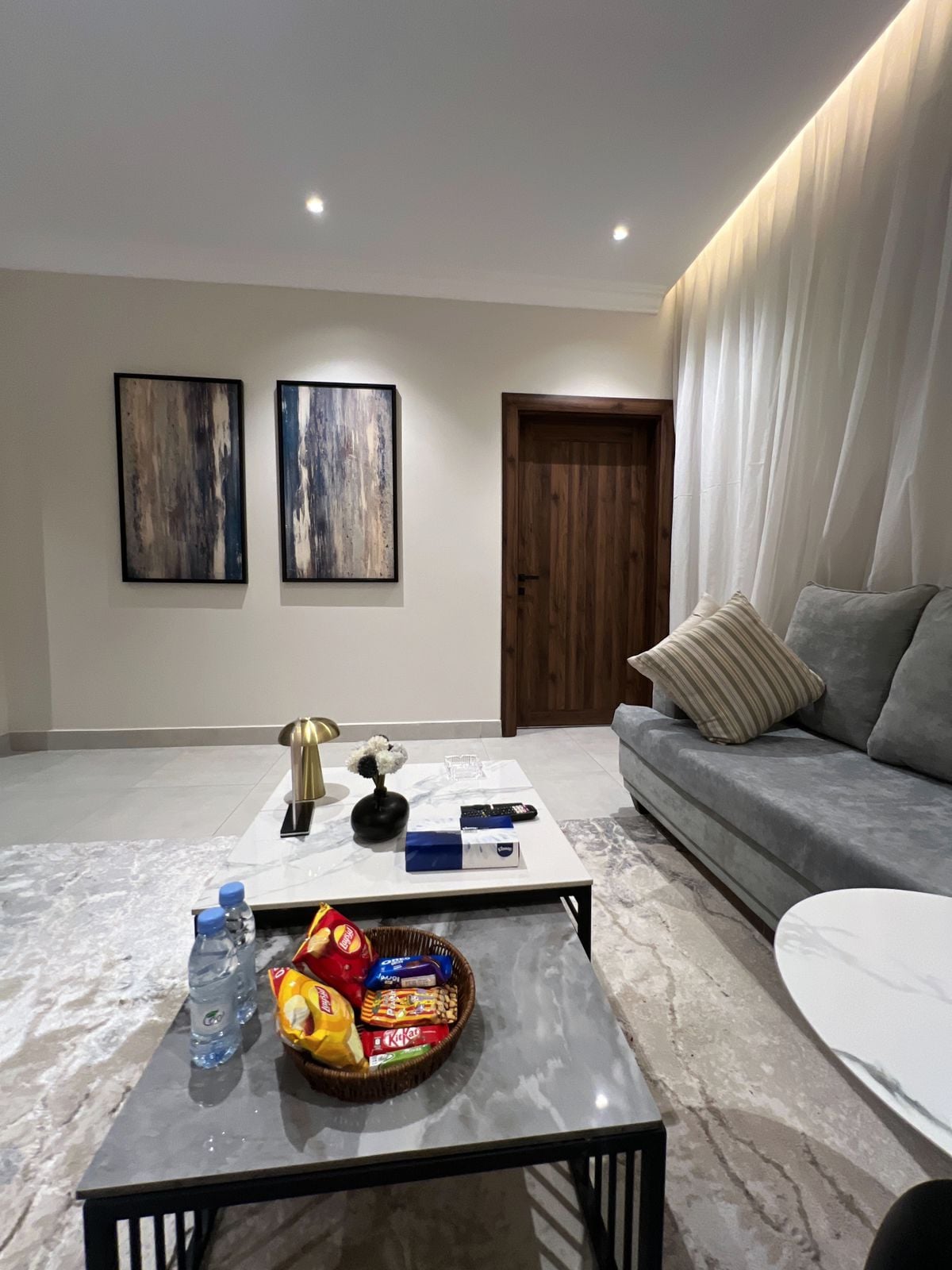 Luxury Apartment with Self-Entry consisting of a bedroom, living room, kitchen, and a fully equipped bathroom (shampoo, slippers, one-time use towels, tissues). • Stunning Boulevard view in Hittin, North Riyadh… The location is ideal, close to major events such as Riyadh Season, Diriyah Season, and all essential services like restaurants and shopping. Specifically: -Boulevard City 1 minute walking -Boulevard World 7 minutes walking -Arena Stadium 8 minutes walking -KAFD 12 minutes driving