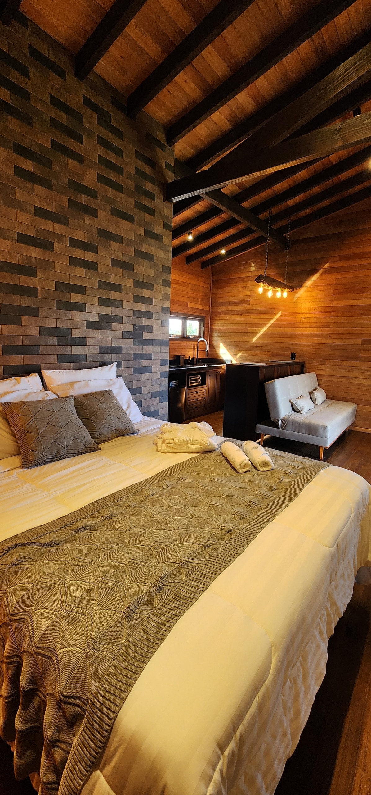 Nossa cabana é super aconchegante e luxuosa, possuímos uma cama super king com lençóis trussardi, chuveiro duplo com vista para o Rio, ofurô com teto de vidro e uma cozinha completa. Venha viver momentos especiais e crie memórias incríveis!