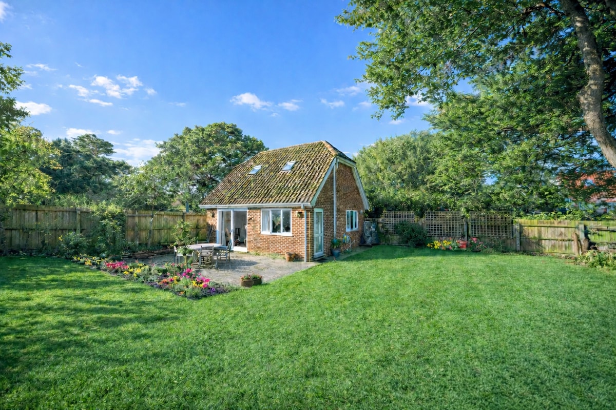 Çimərliyə yaxın Norfolk kotteci. Ayrıca parkinq/bağça