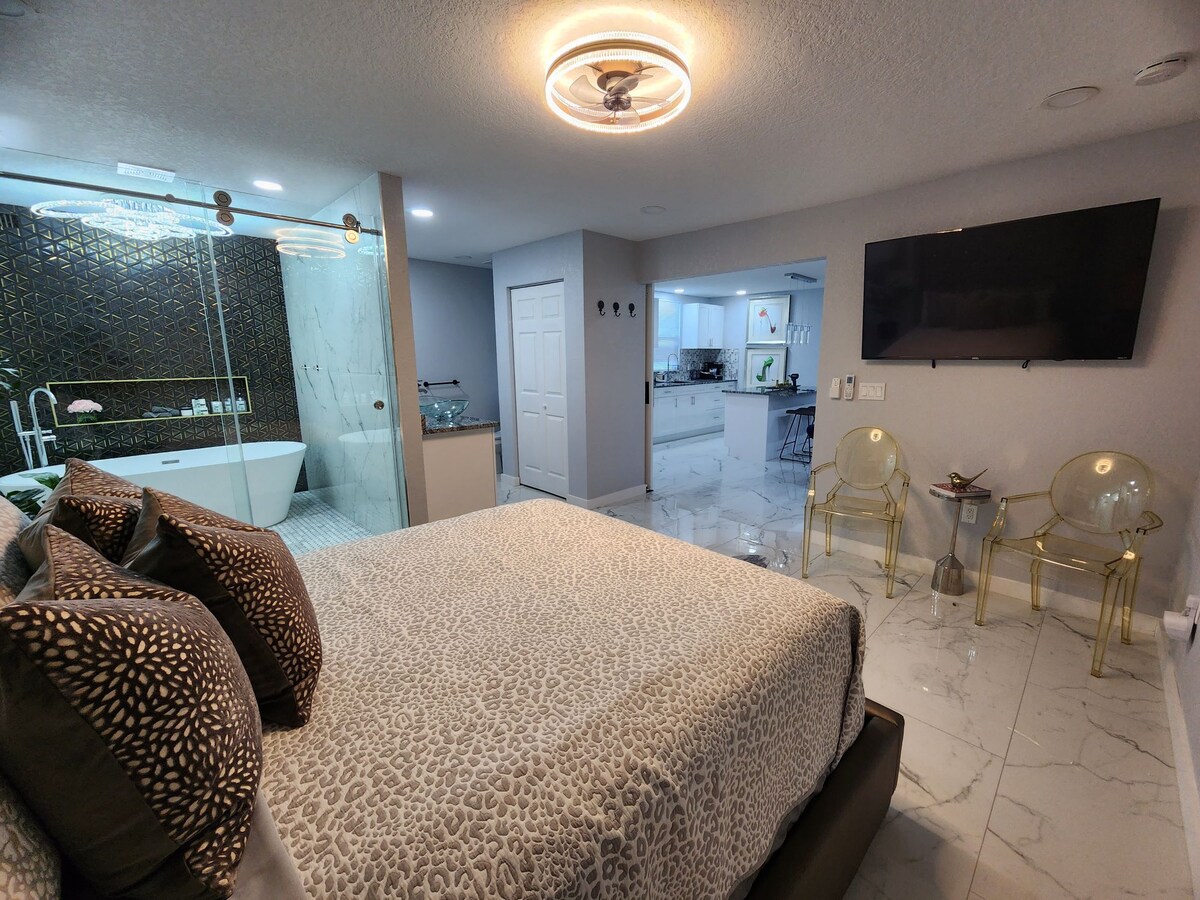 BU MƏKAN YALNIZ İKİ QONAĞIN EKSKLÜZİV İSTİFADƏSİ ÜÇÜNDÜR. Bütöv süitanı əldə edirsiniz. Müasir açıq konsepsiyalı bu süita özəl və rahatdır, romantik tətil və ya sadəcə işgüzar səyahət və ya tətil üçün idealdır. Seminole Hard Rock & Casino-ya piyada məsafə. Mətbəxi, rahat 150-179 sm-lik çarpayısı, hamam otağı, 55" TV (Roku) İnterneti (Wi-Fi) və ayrıca girişi var. Yaxınlıqda bir çox görməli yerlər yerləşir (Buş Bağı, Macəra Adası Parkları, Şəhər Mərkəzi, Restoranlar və Florida Ştat Yarmarkaları.