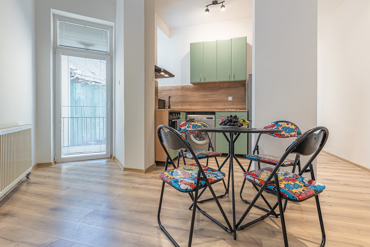 Geniş mənzil Bratislavanın mərkəzində Prezident Sarayı və Hökumətin yanında yerləşir. Mənzildə 2 nəfərlik ayrıca yataq otağı və qonaq otağı və yemək otağı ilə birləşdirilmiş sahədə hər biri 3 nəfərlik 3 çarpayı var. Buraya şərab anbarı və siqaret çəkmək imkanının olduğu həyət daxildir. Wi-Fi, Netflix, iki kondisioner ilə təchiz olunub. Qatar stansiyası 10 dəqiqəlik piyada məsafədədir. Pulsuz parkinq yalnız həftəsonları, həftə ərzində ödənişlidir. Gənclər üçün uyğundur. Ev heyvanları xoş gəldi!