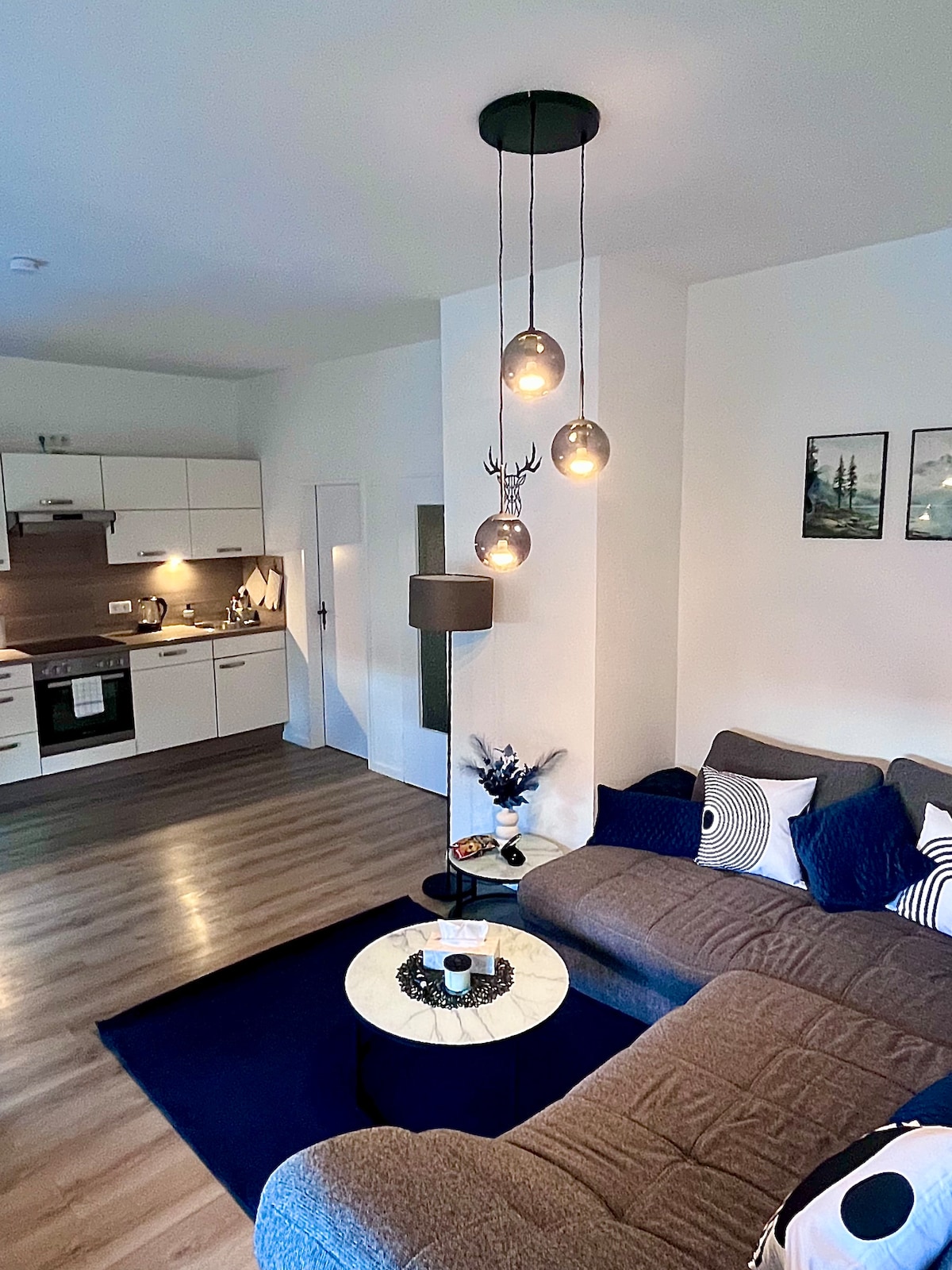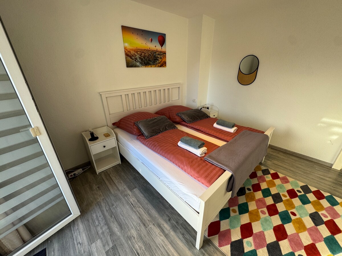 57m2 iki otaqlı mənzilimizə xoş gəlmisiniz! Yataq otağında (nömrə 1) ikinəfərlik çarpayı, tualet masası, qarderob və eyvan var. Yataq otağında (№ 2) əkiz çarpayılar, divan və böyük Smart TV var. Tam mətbəxdə həmçinin 4 nəfərlik yemək masası və paltaryuyan maşın var. Var - Avtobus stansiyaları - Kafelər - Restoranlar - Çörəkbişirən - Volksbank və Sparkasse - Mağazalar (Penni, DM, Rewe, Takko)