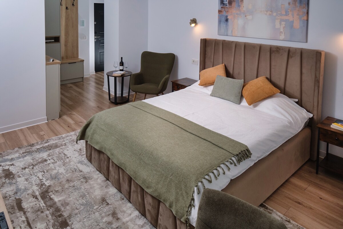 Welcome to our beautiful and modern apartment, located in the heart of the city! The apartment features a spacious and cozy bedroom with a comfortable queen-sized bed, plush linens, and plenty of closet space. The living room is bright and airy, with large windows that let in plenty of natural light. It's the perfect place to relax after a long day of sightseeing or work, with a comfortable sofa, a flat-screen TV. We look forward to hosting you in our beautiful apartment!