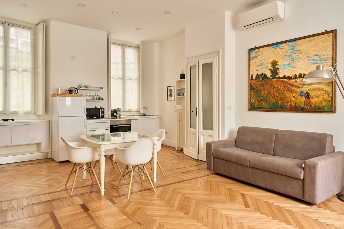 Bu dizayner mənzilində Milanese həyat tərzindən zövq alın. - Tavanların hündürlüyü 3,5 mt - Yağış duşu ilə böyük pulsuz vanna - Son nəsil 1Gh WiFi - Çox sakit - Prestijli dövr binası - S. Ambrogio, Duomo və Piazza Cordusio 'dan bir neçə addım (CBD) - 66sqm, yeni təmir - Parket, A/C - Çarpayı 160x200 - Müxtəlif hündürlüklü lələk yastıqları və döşək 27 sm - Kapsulalı Nespresso, çaydan - İkiqat şüşəli və qaranlıq interyeri olan Windows