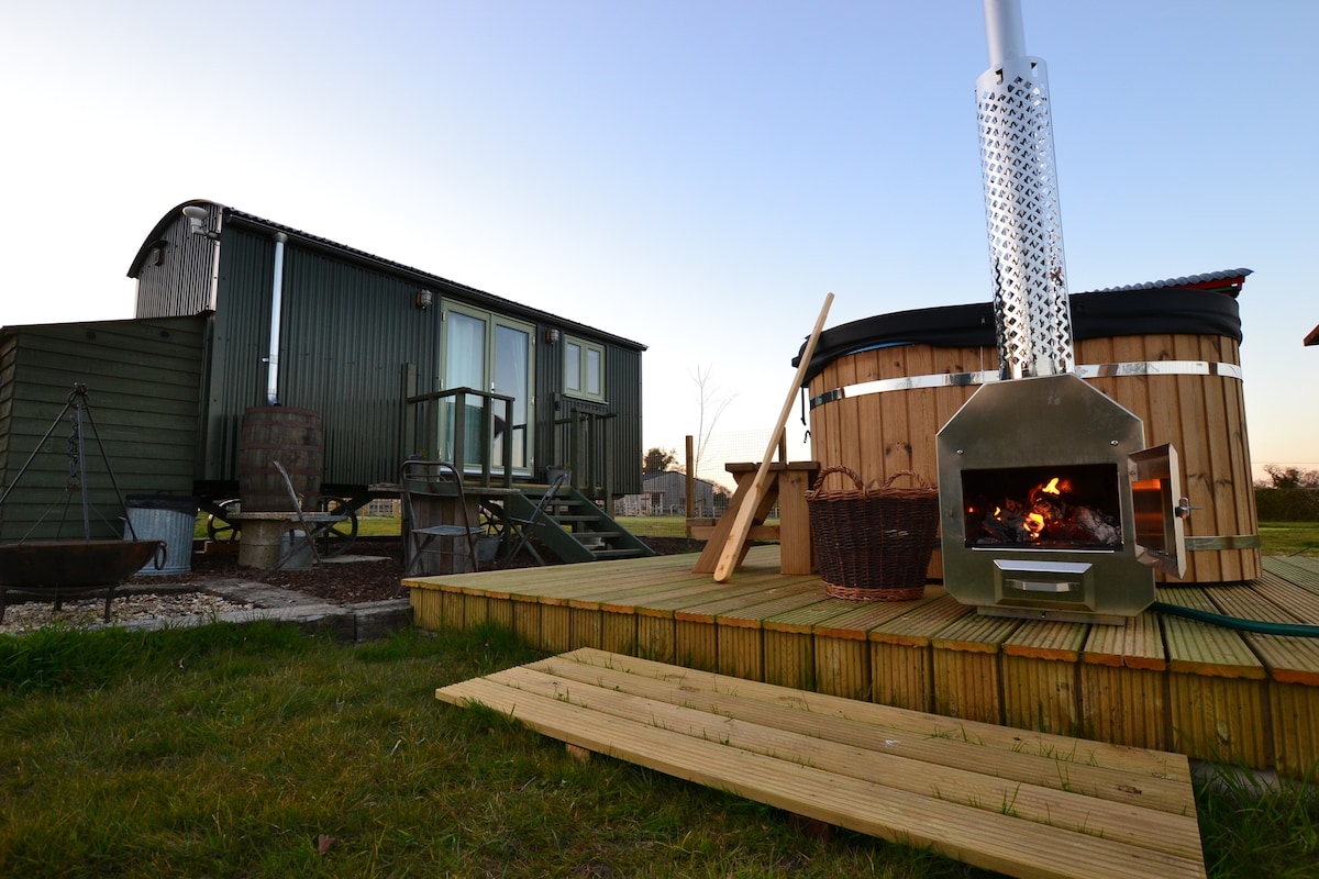 Our four luxurious shepherds huts with hot tubs are located on the edge of our field. You can enjoy the views and see the beauty this special place boasts from sitting in your own hot tub. Take in the tranquility and ever changing countryside scenery our village has to offer. Outside each hut you have a decked patio area with seating and a covered decked area with additional seating and bbq. Our family have worked Berry Hall Farm for over 100 years! One hut onsite allows dogs!