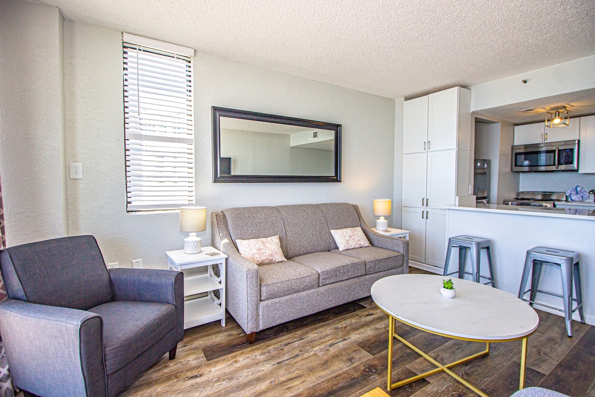 2019-cu ildə tamamilə təmir edilmiş, kvars piştaxtalar, şkaflar və yeni paslanmayan avadanlıqlar, yeni qonaq otağı, yemək və yataq otağı və mebel, döşəmə, jinormous TV, yeni pərdələr, yataq dəsti, işıqlandırma, boya və daha çoxu ilə okean sahili kondominium! Müasir, xəfif, təsadüfi və rahatdır! Evdən öz komfortlarınız üçün çoxlu ev şəraiti və çoxlu saxlama yeri təmin etmişik. MB-nin mərkəzində yerləşir və bir çox restorana, qəhvə mağazalarına, barlara, konqres mərkəzinə, taxtaya və daha çoxuna qısa bir gəzinti!