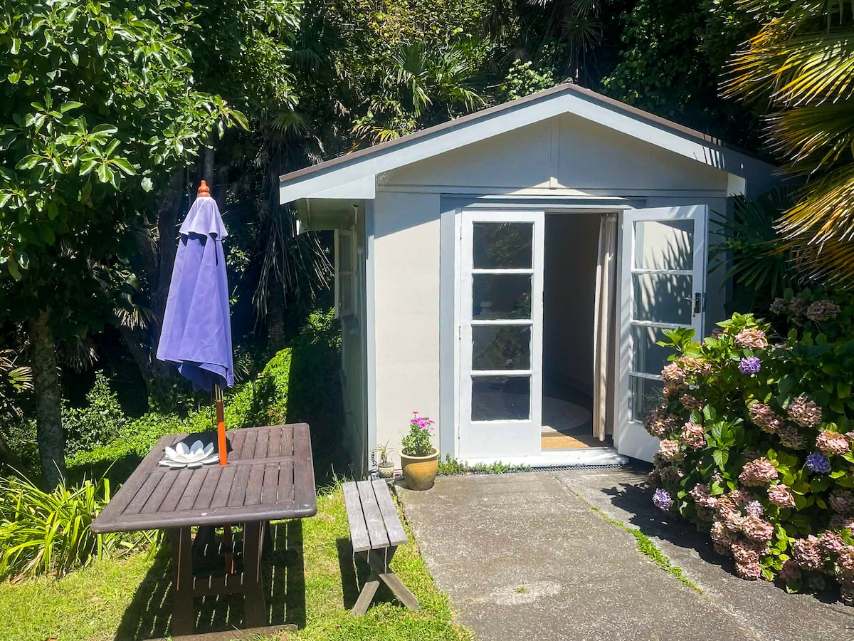 This is our sleepout located next to our family home. It is artistic and peaceful. It is nestled within a 1 ha property with established fruit trees and many things for families to do and play. The sleepout has a separate wash space/kitchenette and bathroom, about 7 metres away from the sleepout. The beach is right opposite the house, and Mapua is a 2-minute drive. It's an ideal space to land in before and/or after a hike in the Abel Tasman, which is only 30 minutes away from us.