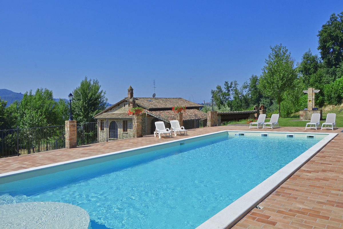 Scopri l'Umbria soggiornando in una bellissima villa dotata di 3 camere matrimoniali con bagno privato, due saloni e una cucina. Potrai godere del giardino e dell'uso esclusivo di una vasca idromassaggio e della piscina. In una delle camere troverai una splendida vasca idromassaggio per i tuoi soggiorni romantici.