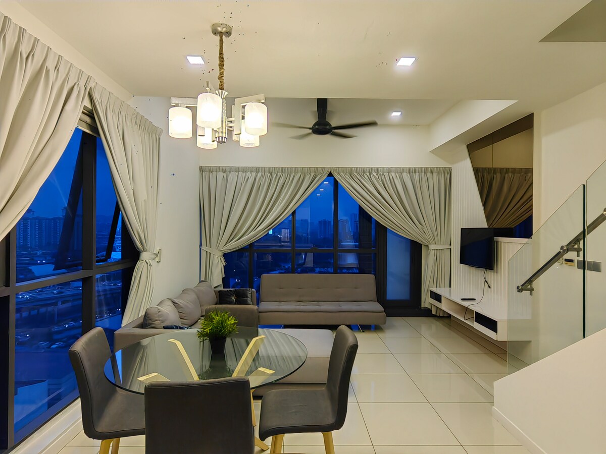 Qrup tətilləri üçün mükəmməl olan bu dəbli geniş LOFT Duplex qurğusu. Nəfəskəsici maneəsiz KLCC mənzərəsi və döşəmədən tavana qədər pəncərələri olan KL səması. 2 Kral, 1 Kraliça və Tək Çarpayı. Sadə və dəbli mebelli bir qurğu vanna, mətbəx və yemək otağı ilə təmin olunub. İkonik KLCC Əkiz Qüllələri və KL Skyline-a baxan 48 Sonsuzluq hovuzu və gimnaziyadan zövq alın. Kuala-Lumpurun ən yaxşı sonsuzluq hovuzundan biri. 48-ci mərtəbə Hovuz Göyərtəsində 360 dərəcə Kuala-Lumpur mənzərəsini seyr etmək.