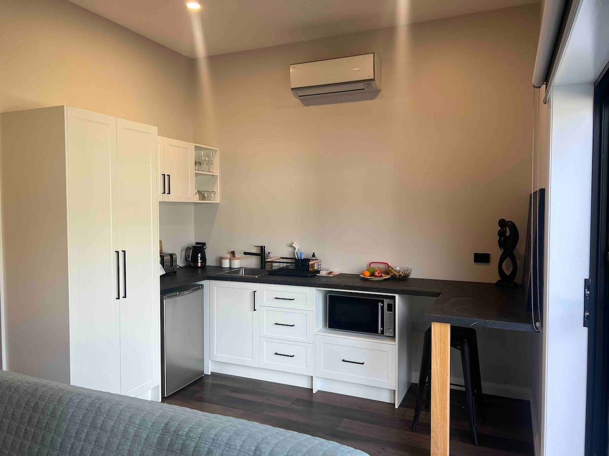 Enjoy your own private guest suite set on 15 peaceful acres. This compact, fully self-contained studio cabin features a double bed, separate bathroom (shower, toilet, vanity & washing machine), and a kitchenette with electric cooktop, microwave, kettle, toaster and fridge. WiFi included. We live separately on the property, and there are two Airbnb cabins in total, each privately positioned.