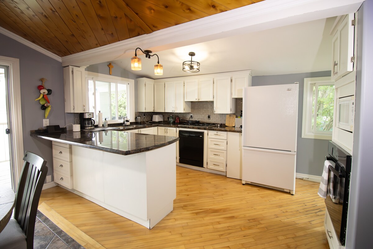 Sahilyanı AAT Timber A-Frame tətilinizə xoş gəlmisiniz. Fransız çayının üstündə yerləşir. 2+ hektar şimal meşəsi ilə əhatə olunmuş bu memarlıq inzivası lüks və təbiəti birləşdirir. Parlaq açıq konsepsiya məkanında toplaşın və ya açıq havada ocağın yanında, yaxud da il boyu açıq olan cakuzidə dincəlin. Rahat loft və əlil arabası üçün uyğun olan əsas king otağı ilə 6 nəfərlik yataq yeri. Əlaqə, rahatlıq və unudulmaz anlar üçün hazırlanmışdır. AAT-da unudulmaz xatirələr yaradın.