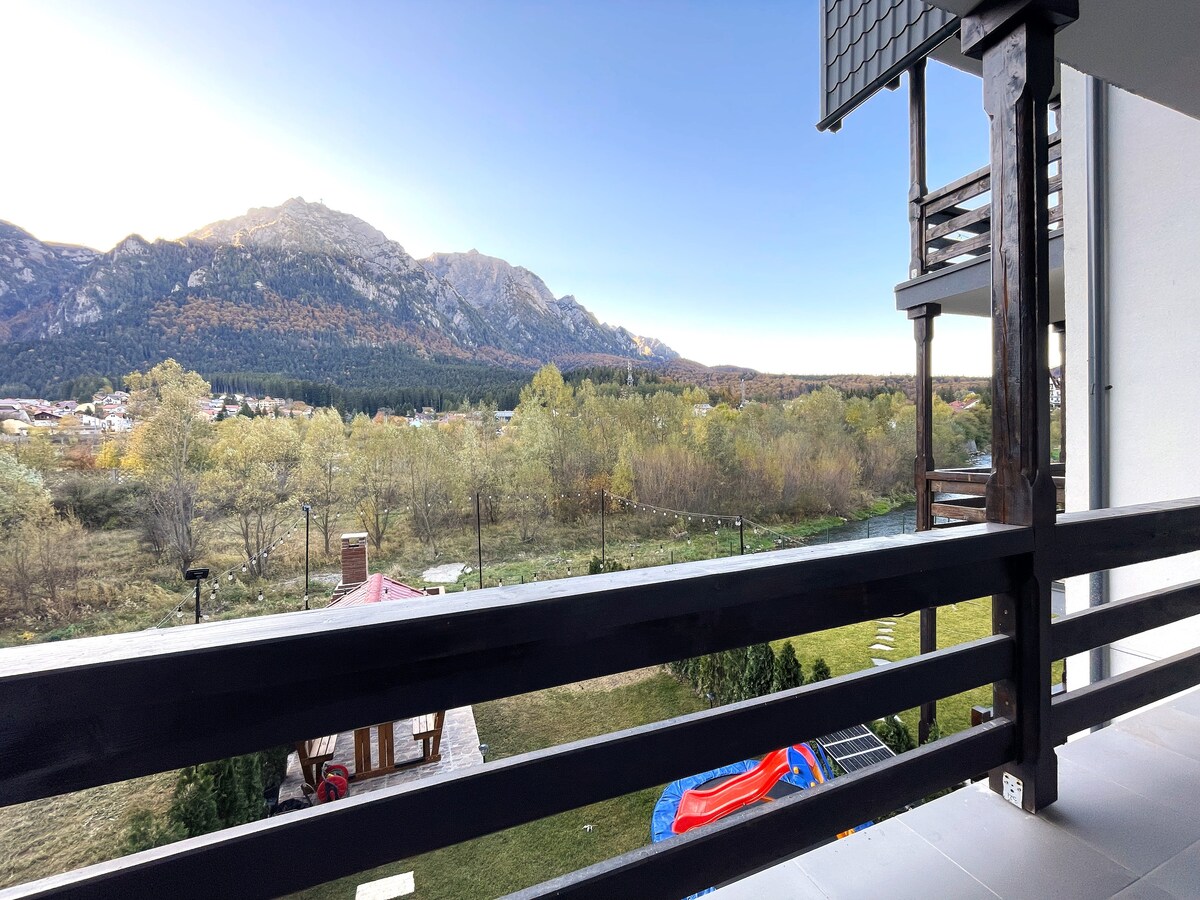 Welcome to our riverside sanctuary in Busteni - an enchanting two-bedroom apartment that aims to impress its guests with a gorgeous river and mountain views from the delightful outdoor terrace lounge. Step into a chic interior that seamlessly combines comfort and style, complete with a fully equipped kitchen. Reconnect with nature at this tranquil riverside escape, conveniently located within walking distance of the city center and other captivating attractions in the area.