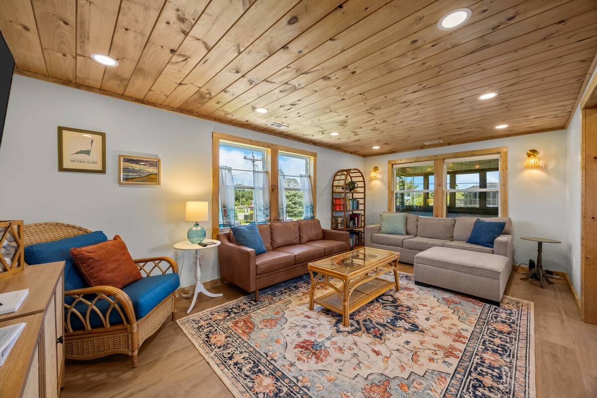 Step Back In Time in this one story quaint Hatteras beach cottage/Duplex.Park car- you will not need to drive again! Here it is like living in old village where you can walk everywhere-beach,light house national park,bait tackle store,restaurants,ice cream, putt-putt,arcades etc. Fishing,Surfing Paradise. Newly updated winter 22'-new bathrooms and vinyl planking throughout.