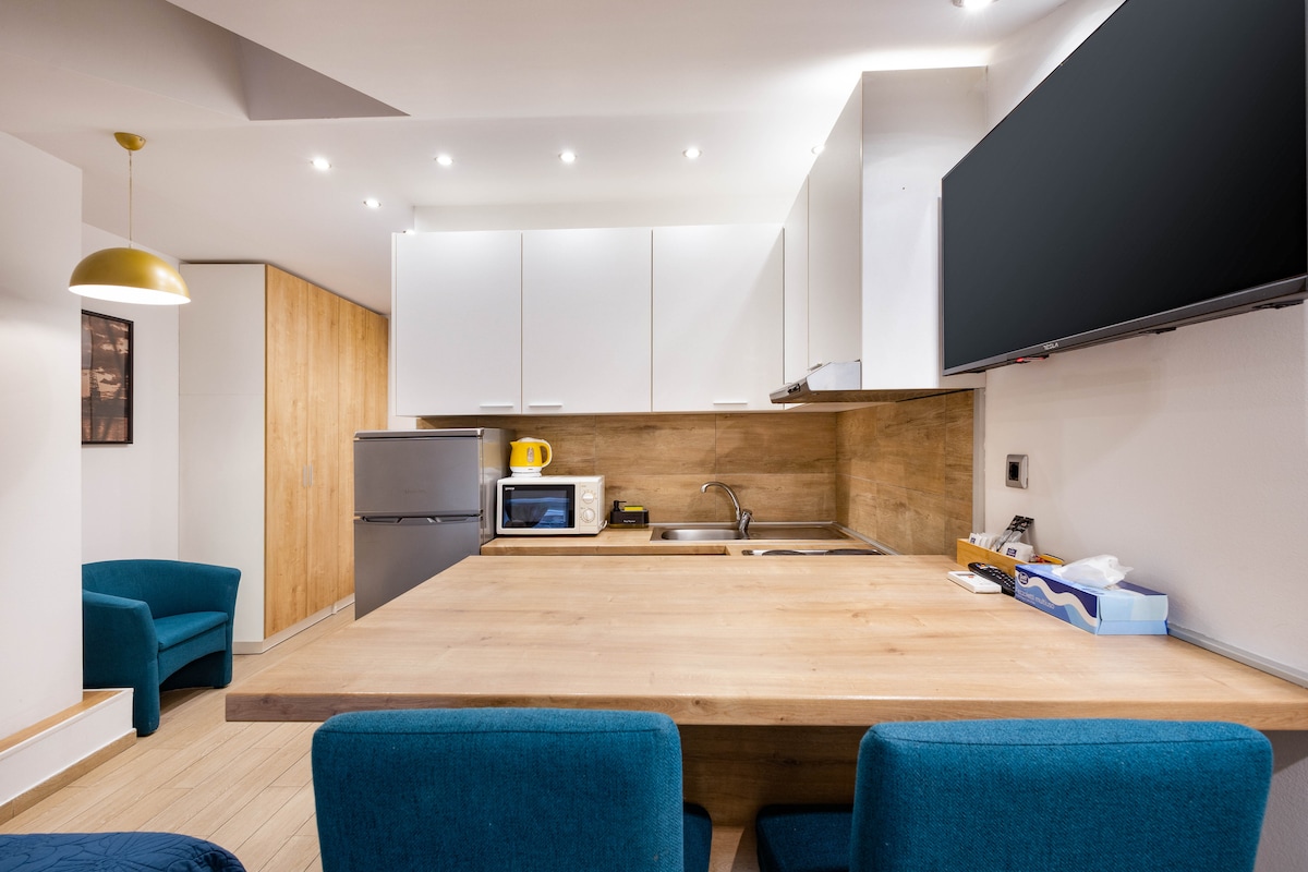 Bu müasir mənzilə tam (yemək yeyən) mətbəx, kombinə edilmiş yataq otağı və rahat açılan divanı olan qonaq otağı və bu yaxınlarda yenilənmiş hamam otağı daxildir. Mənzil birinci mərtəbədə yerləşir və tarixi şəhər mərkəzində yerləşir. Xüsusən də avtobusla gəldikləri halda cütlüklər üçün idealdır, çünki mərkəzi avtovağzaldan bir dəqiqəlik məsafədə yerləşir. Mənzil çox yaxşı təchiz olunub. Qabyuyan və paltaryuyan maşın mətbəxdə, televizor isə kondisionerli qonaq otağında yerləşir.