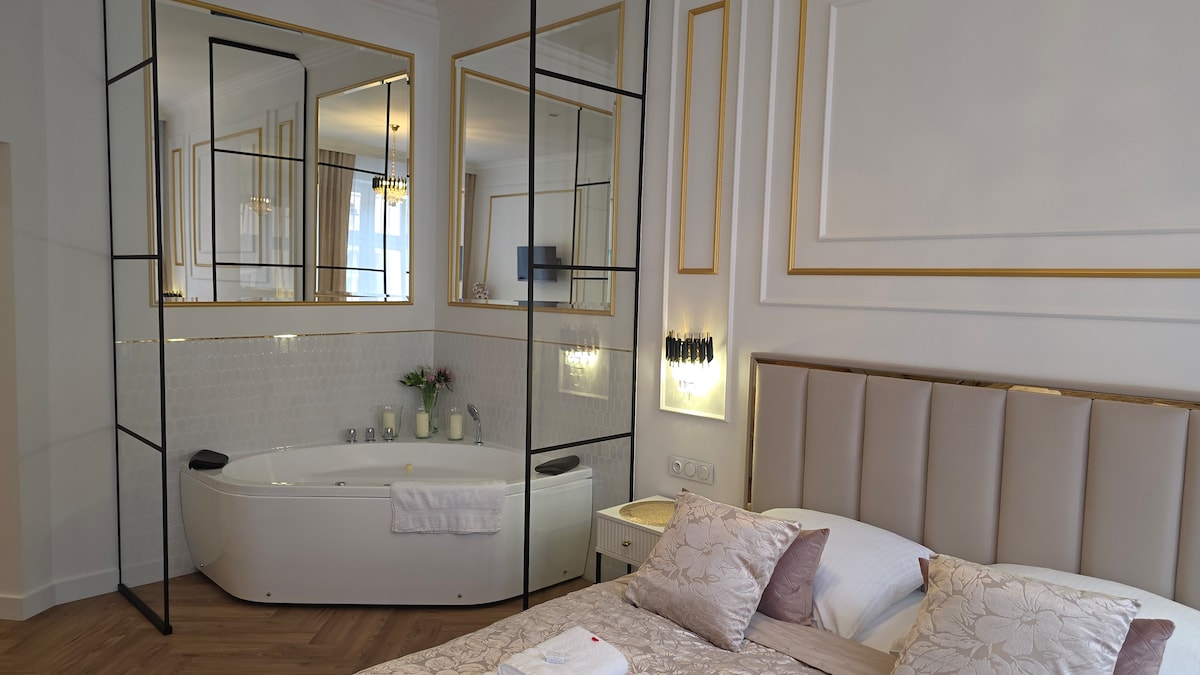 💎 🇫🇷 Paris ab-havasını hiss edin! 🥂 Buxarıdan 🌡️, qramofondan 💿, Premium Marshall Audio-dan 🎼 və SURƏTLİ WiFi-dan (Rahatlıq və Müstəqillik Zəmanətli) zövq alın. Bu, eksklüziv, iki otaqlı Art Déco üslublu məkanınızdır. Lüks və uzun həftəsonu və ya işgüzar səfər üçün mükəmməldir. Şəhərin mərkəzində, 1906-cı ilə aid tarixi binada yerləşən, kondisioneri olan zərif mənzil. Bıdıqşçun ən yaxşı yerlərini kəşf edin – Bazar Meydanı, Teatr və Brda çayı boyunca cazibədar yollar çox yaxındadır.