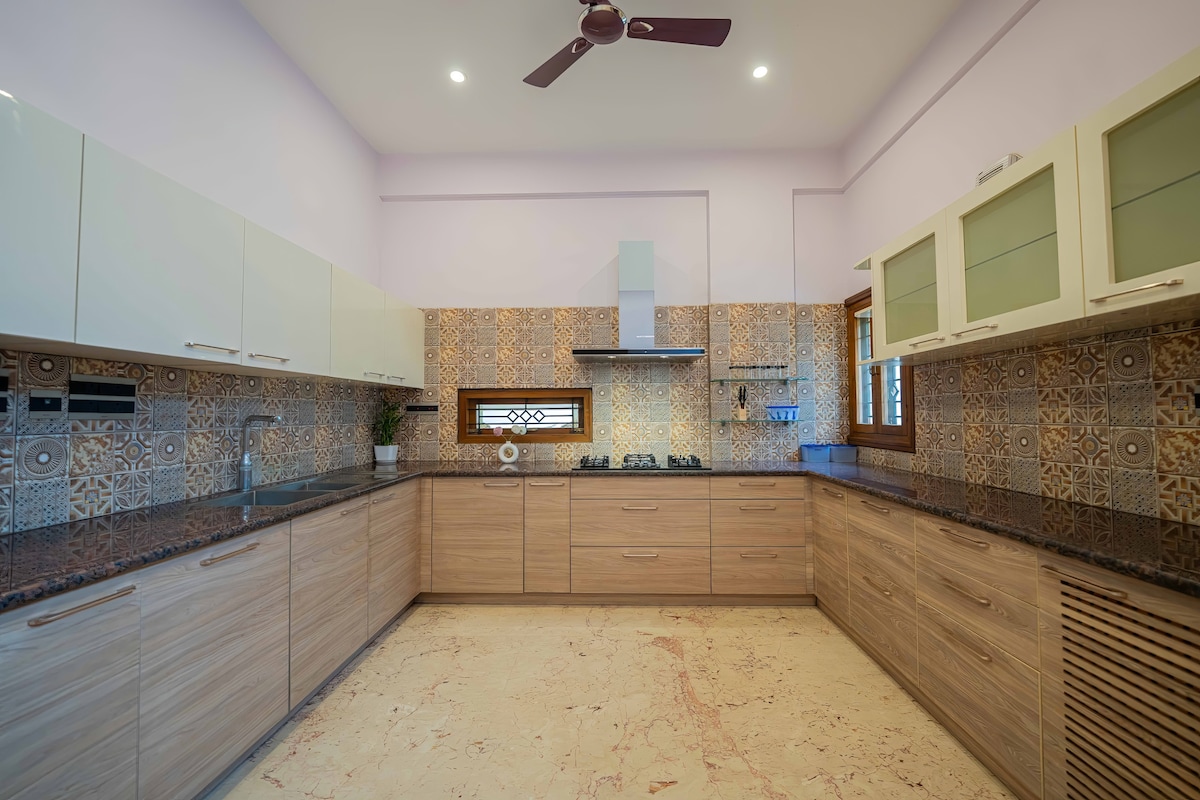 A bright, spacious 4BHK wrapped in greenery—perfect for families, group stays & peaceful work trips. Enjoy cozy bedrooms, balcony coffee moments, foosball/board games, and a fully equipped kitchen for easy, comfortable stays. Clean, calm and inviting—designed for a restful experience. Includes 65” Smart TV + Netflix, fast Wi-Fi and a sunny green-view balcony. ⚠️ No parties / no loud music. Quiet hours after 10 PM. ⚠️ Only confirmed guests may stay overnight. 🐾 Pets only with prior approval.