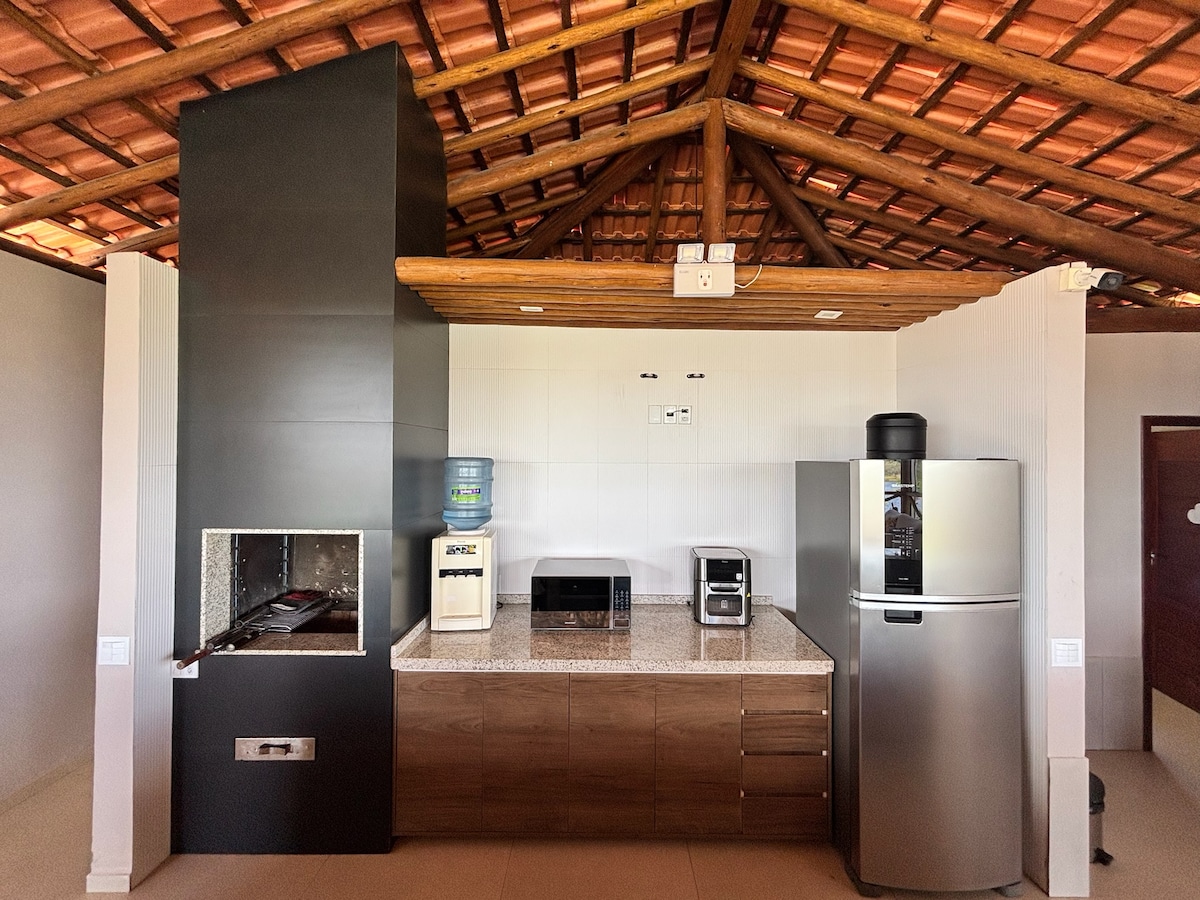5 yataq otağı (3 kondisioneri olan), 3 vanna otağı, mətbəxi, hovuzu, barbekü olan sahəsi, çaya çıxışı və çay kənarında köşkü olan ev. Casa com wi-fi.