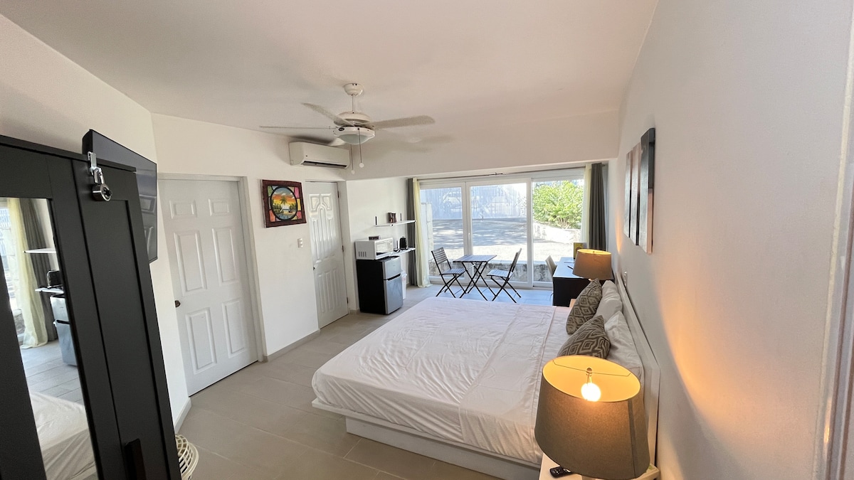 1 / 1 Stays 7 days or more will get free airport pickup, please message me. 1-bedroom private condo with a shared pool, laundry, and one parking space, walking distance to grocery, and minutes to town and beaches. The home features a workstation that is ideal for remote work, while the balcony offers comfortable seating..The kitchen comes equipped with everything you need to cook and the living room offers a smart TV. Two A/Cs. Electric is not included guests get $15 credit for trips 2-5 days
