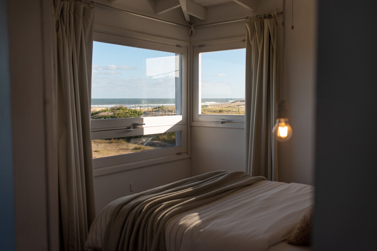 Punta Rubiyada çimərlikdən iki mərtəbə yuxarıda, dyunlar üzərində sakit məhəllədə və dənizdən metr məsafədə isti taxta ev. La Pedrera 1 km, Kabo Polonio isə 37 km məsafədədir. Vəd edilən çimərlik! Evdə qonaq otağı, inteqrasiya edilmiş mətbəx və hamam-tualet olan PB var. PA-da 2 yataq otağı. Biri ikinəfərlik çarpayısı olan, fotoda görünən göyərtəyə çıxışı olan biri, digəri isə sadə çarpayı və iki kreslo ilə. Çarpayıya, istirahət kreslosuna çevrilmək imkanı da var.Outdoorarray. Nuş olsun!