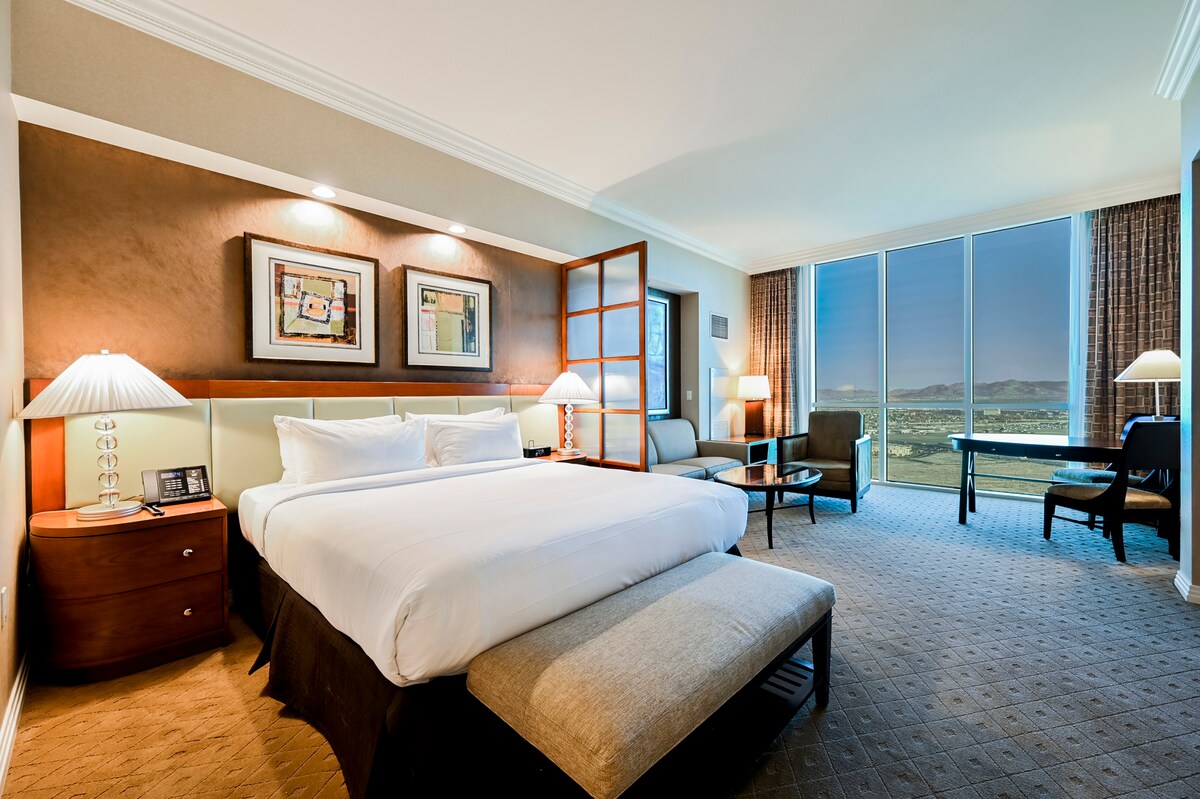 Palms Place-də (A Palms Casino Property) yerləşən Las-Veqas bulvarının heyrətamiz mənzərəsi. Bu əmlakda geniş bölüşdürülmüş süita konfiqurasiyası (1 yataq otağı süitası + studiya süitası 1,865sqft. cəmi) var. Bu ultra-modern dekorasiya süitası qara paslanmayan poladdan hovuz masası, tam ölçülü retro 80 sırası və zolağa baxan yataq otaqlı cakuzi vannası təklif edir. Yerdən tavana qədər uzanan pəncərələr, motorlu jalüzlər və Las-Veqas Stripin çarpıcı mənzərələrini seyr etmək üçün geniş açıq balkon
