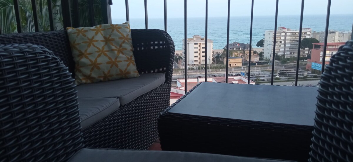 Bonito y acogedor apartamento frente al mar. Estamos en el piso 9° de una finca de nueve plantas. Esta en una zona peatonal muy tranquila llamada " la isla " Hay aparcamientos cerca de la vivienda, supermercados, bares, restaurante, farmacia... En 5 minutos caminando estas en la playa. Y en 7 - 8 en la estación de tren. En poco mas de 30 min estas en el centro de Barcelona y a 50 min del aeropuerto de Barcelona y 40 min el de Girona.