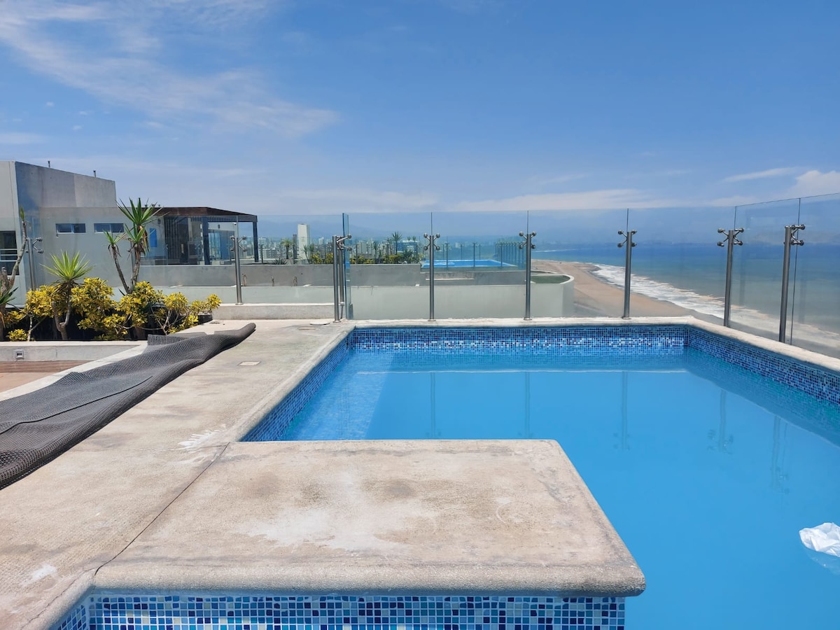 Hava limanının yaxınlığında gözəl okean mənzərəsi olan mənzil və Limada bütün komfortlarla təchiz edilmiş ən yaxşı turistik yerlər. Qonaq otağı, masa, balaca mətbəx, 150-179 sm ölçülü çarpayısı olan bir yataq otağı, bir hamam otağı və bir okean mənzərəli terras. Sosial sahələr: kino otağı, oyun otağı, od çuxuru olan veranda, camaşırxana, böyüklər üçün otaq, idman zalı, sauna, manqal sahələri, hidro-masaj vannası olan terras, böyüklər və uşaqlar üçün üzgüçülük hovuzu.