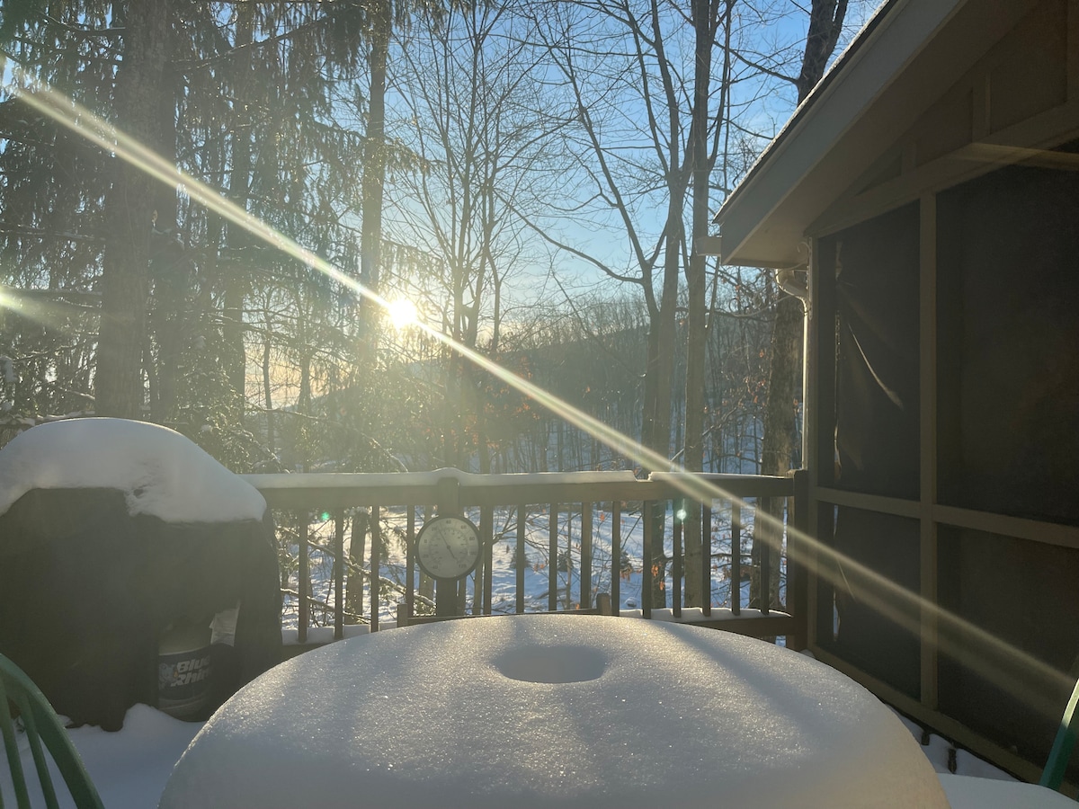Yüksək Keçid Lojasına xoş gəlmisiniz! Təzə təmir edilmiş və rahat şəkildə Camelback Dağının üstündə, piyada məsafədə xizək mərkəzli. Qonaqların zövq alması üçün qapalı qızdırılmış hovuz, sauna, cakuzi və daha çoxu (qonaqlamanıza daxildir). İstənilən mövsüm üçün Su Parkları, Böyük Pokono Dövlət Parkı, Pivə zavodları, Kazinolar, Pocono Raceway, Alış-veriş Çıxışları, Restoranlar və daha çox fəaliyyətlərə yaxındır. Qrildə olarkən göyərtədən valehedici mənzərələrdən zövq alın və ya qonaq otağının buxarısının və Roku TV-nin qarşısında rahatlayın.