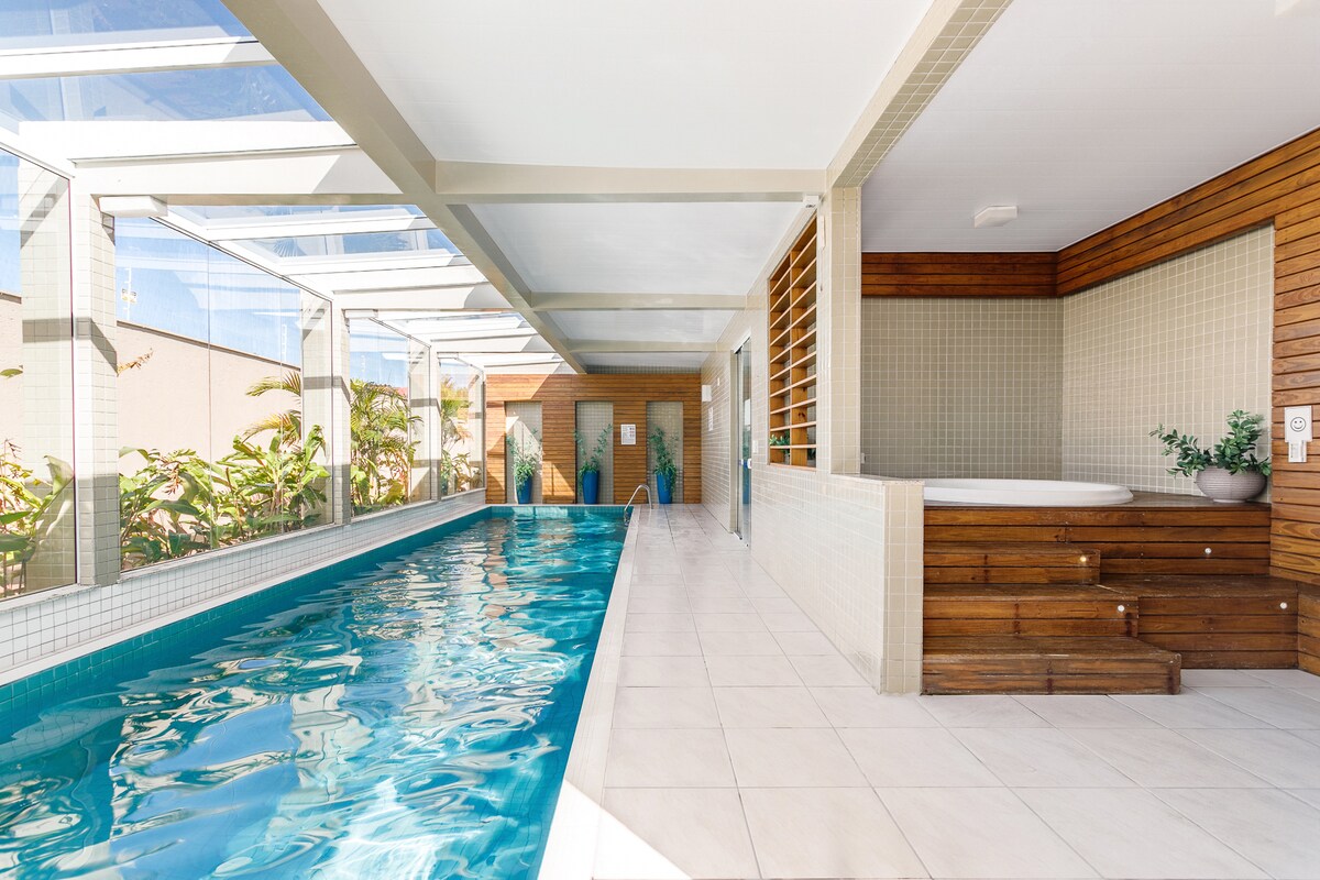 Apartamento aconchegante e com muito "borogodó" em condomínio Thai Beach Home Spa, alto padrão FRENTE MAR, piscina aquecida e spa. 1 dormitório, sala integrada à cozinha, ambientes decorados e equipados para sua estadia ser perfeita. Espaço acomoda até 4 pessoas, 2 na cama queen e até 2 no sofá cama amplo da sala. Lazer disponível: - Piscinas e jacuzzi ao ar livre - Piscina AQUECIDA coberta e SPA quentinho; - Academia; - Sala de massagens; - Parquinho para crianças; - Cinema