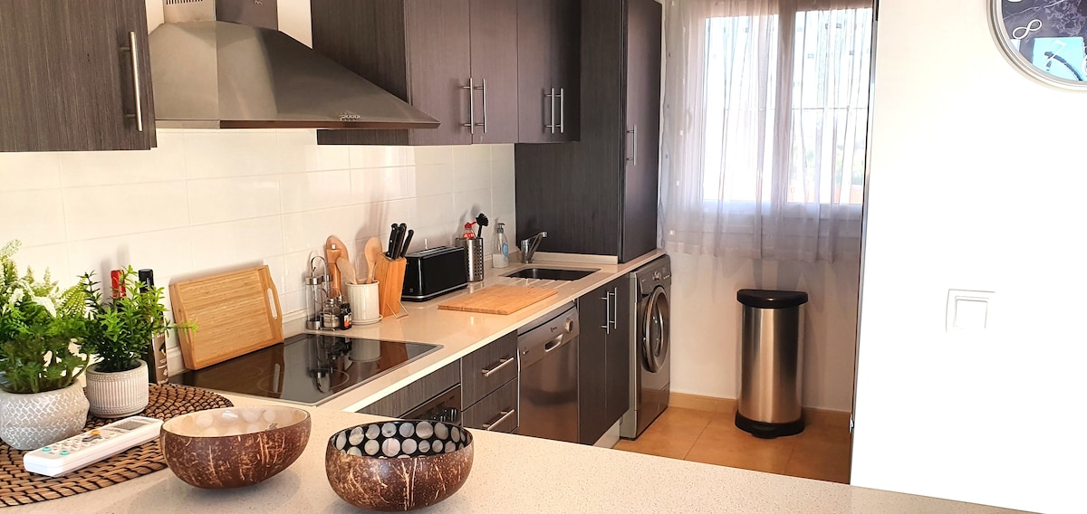 A modern, two-bedroom apartment with a spacious terrace in the heart of Playa Flamenca offers comfortable interiors, two bathrooms, a fully equipped kitchen, a washing machine, a hairdryer, a dishwasher, and air conditioning. Each bedroom and the living room feature a Smart TV. Complex amenities include pools - two of which are heated year-round — a jacuzzi, sauna, gym, playground, bar, and underground parking. Close to beaches, shops and restaurants. Perfect for an unforgettable stay!