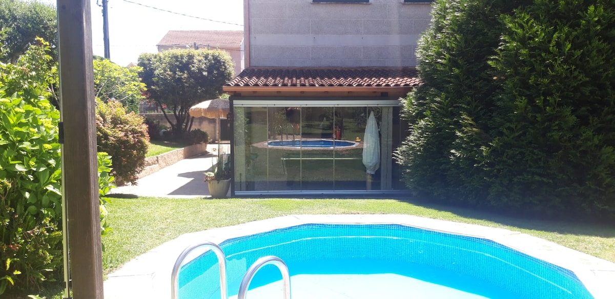 Kənd mühitində villa, tamamilə yeni və müasir, üzgüçülük hovuzu, barbekü sahəsi və pinqvin masası olan 1200 m-lik bağ. Cütlüklər, ailələr və qruplar üçün idealdır. Çimərlik əraziləri (Sanxenxo, A Lanzada, O Grove, Combarro, Arousa adası...) və Santyaqo de Kompostela kimi şəhərlər üçün sürətli bir yol ilə çox yaxşı əlaqədədir. Pontevedra şəhərindən 5 dəqiqəlik məsafədədir. Yaxınlıqda atçılıq mərkəzi və yemək üçün bir neçə furanç (tipik yemək) var. Maksimum 12 nəfəri yerləşdirmək imkanı mümkündür.