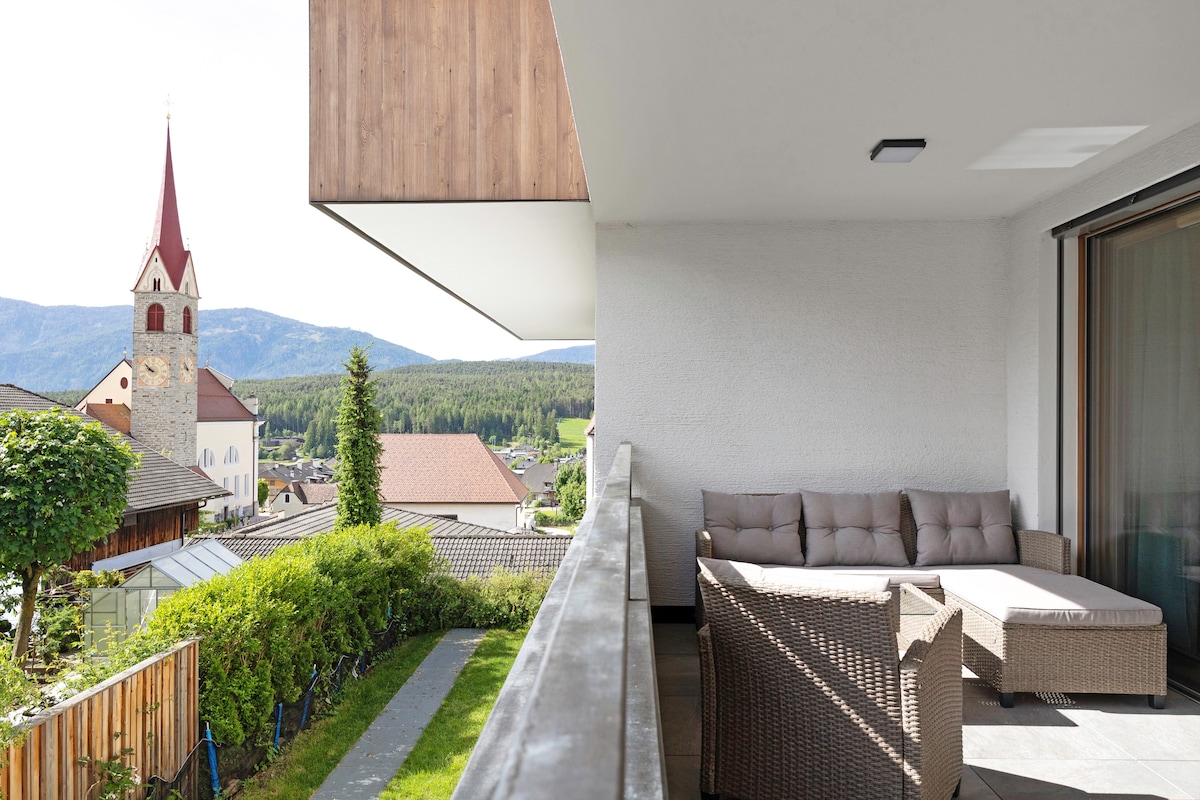 Bu rahat mənzil hətta daha uzunmüddətli qonaqlamalar üçün də maksimum 5 nəfər üçün idealdır. Avtomobilinizi yeraltı avtomobil dayanacağında park edə bilərsiniz. Cənubda yerləşən balkon mənzildən cəmi 10 km məsafədə yerləşən Dolomitlər və Kronplatzda gözəl mənzərə yaradır. Vadinin əsas şəhəri olan Bruneck Pfalzendən təxminən 5 km məsafədə yerləşir (hər 30 dəqiqədən bir açılan).