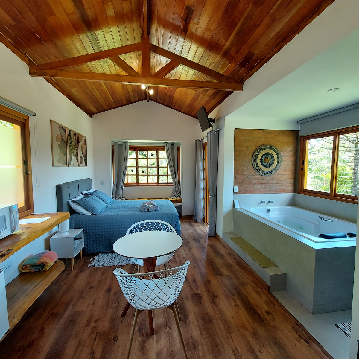 Confortável suíte/estúdio, 28 m2, com entrada independente da casa e linda vista. Espaçosa, acomoda confortavelmente até 4 pessoas. Conta com infraestrutura para o preparo de pequenas refeições. Roupa de cama e banho, além de cobertores e edredons, perfeitamente higienizados. Internet com fibra ótica de alta velocidade. Tv com 80 canais. Localizada no Alto do Capivari, cerca de 2km e meio, do centro turístico. Acesso fácil, com apenas 600mts em rua de terra batida, saindo do asfalto.