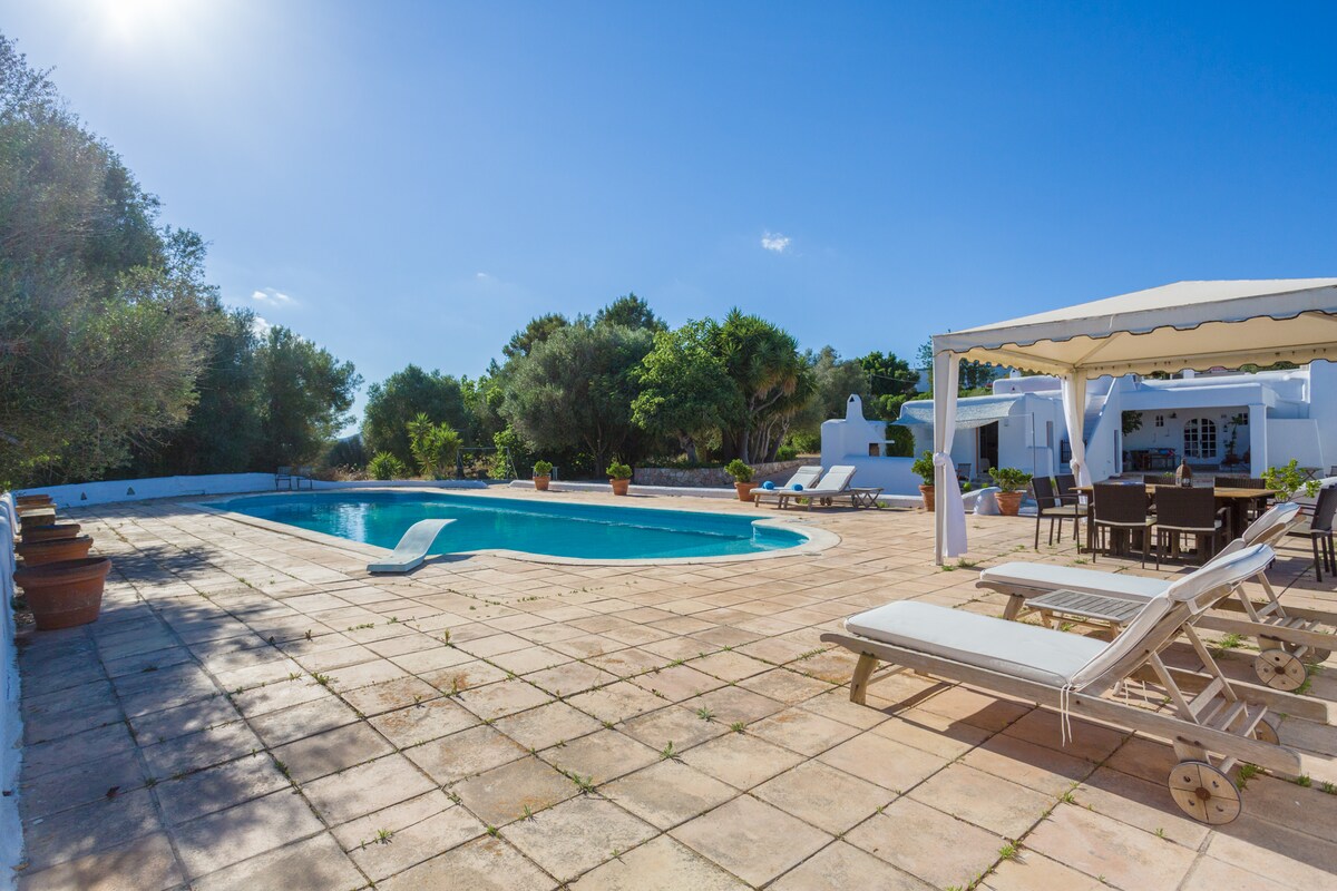 Köhnə ağaclar və çiçəkləri olan romantik yaşıl bağda yerləşən füsunkar, butik üslublu villa. Terrasları, soyunub-geyinmə sahələri və gözəl kiçik ayrıca hovuzu ilə əmlak 8-9 qonaq üçün əla məkan və məxfilik təklif edir. Kondisioneri olan 4 yataq otağının hamısı. İnternet: yüksək sürətli fiber-optik! 6 dəqiqəlik məsafədə Cala Llonga gözəl qumlu çimərliyinə çatırsınız. Restoranlar, supermarketlər, mağazalar və taksi stendinə cəmi 4 dəqiqəlik məsafə var. İbiza qolfuna və ya Santa Eulariyaya 5 dəqiqəlik məsafədədir; İbiza qəsəbəsinə 12 dəqiqəlik məsafə var.