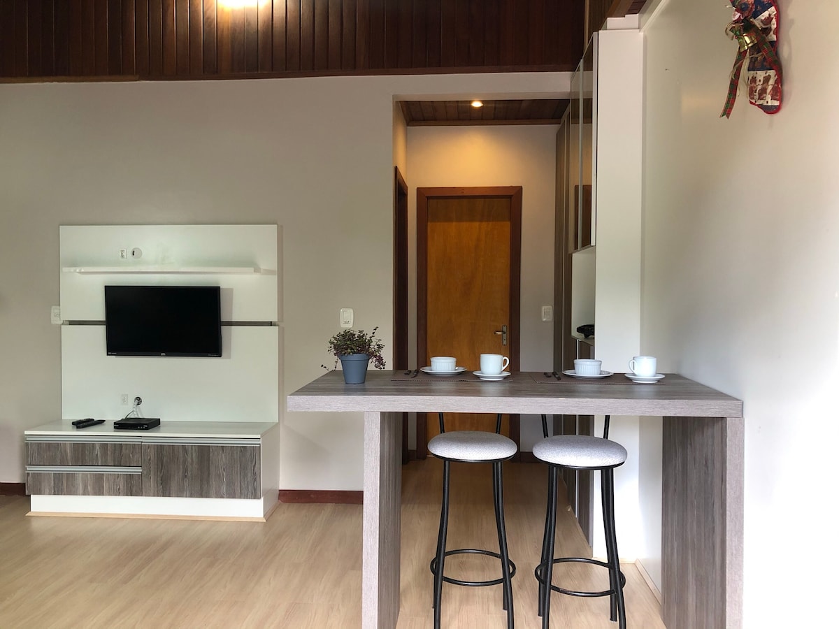 Viva o Natal na Serra e reponha as energias neste charmoso studio em Canela, com vista espetacular da Catedral de Pedra. Com decoração sofisticada, cozinha equipada, lareira acolhedora e quarto iluminado naturalmente, acomoda até 4 pessoas+1criança de até 2 anos. Oferece Wi-Fi veloz, SmartTV, e ar-condicionado. O prédio dispõe de piscina aquecida, sauna, playground para as crianças e academia. Localização estratégica, próxima a restaurantes, cafés e atrações. Perfeito para casais e famílias.