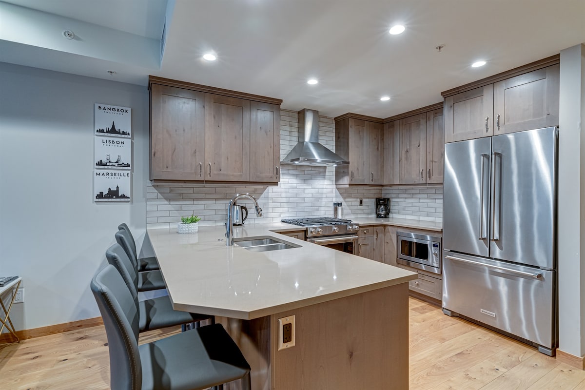 Blue Moose is a newly updated and furnished, spacious luxury one-bedroom condominium with king -sized bed and queen sofa bed. New for 2025: major bathroom and kitchen upgrades. PERFECT LOCATION This modern mountain retreat is situated next to a pristine mountain creek. Follow a creekside nature trail and within minutes you are in downtown Canmore with trendy shops, cafes, food trucks, and both casual and upscale dining.