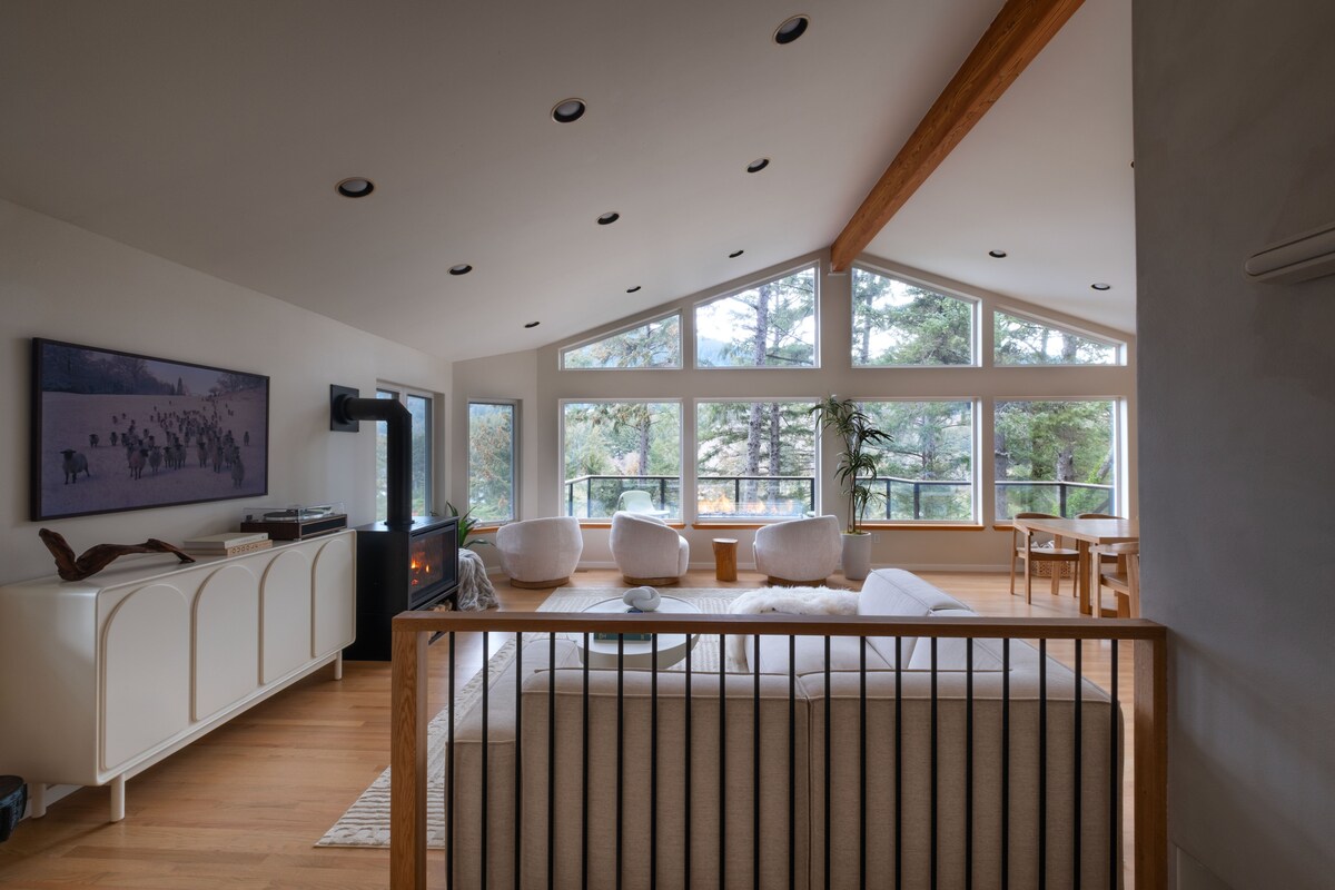 Picturesque mid-century cabin...with your own private riverfront! (As seen on Magnolia Network 'Cabin Chronicles'). Boasting a magical view of huge forest trees and 300 feet of river frontage - enjoy a tastefully curated interior with luxury modern appliances & fast wifi. Soak in the incredible views on our expansive deck with a glass of wine, light a campfire on the private pebbled beach. Enjoy fishing/swimming right from your front door! @rivercabaan | rivercabaan . com