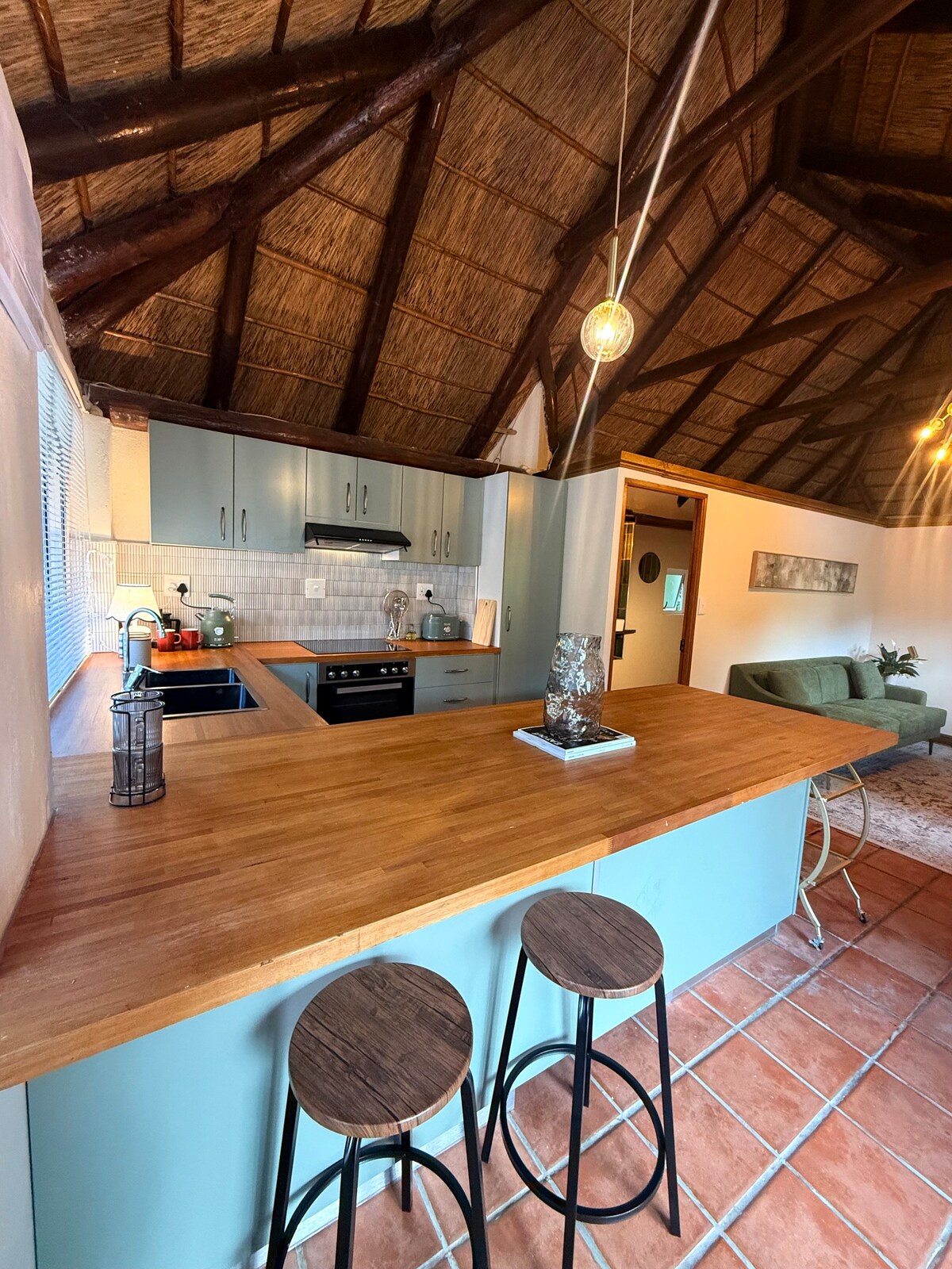 Keyptaunda qonaqlamanız üçün həqiqətən unikal bir şey istəyirsiniz? Hovuz və saunadan cəmi bir neçə metr aralıda, çarpıcı dağ mənzərəsi olan ənənəvi, damı sazdan olan müstəqil kottecimiz sizi gözləyir. Kottecdə tam təchiz olunmuş mətbəx, 50 düymlük televizor və geniş ikinəfərlik çarpayı kimi bir çox müasir imkanlar var. Haut Bey çimərliyi bir neçə dəqiqəlik məsafədə yerləşir. Masa Dağı Milli Parkındasınız, burada gəzinti, velosiped yolları və əlbəttə ki, Konstansiya Şərab Yolu sizi gözləyir. Hovuz və sauna qonaqlarla paylaşılır