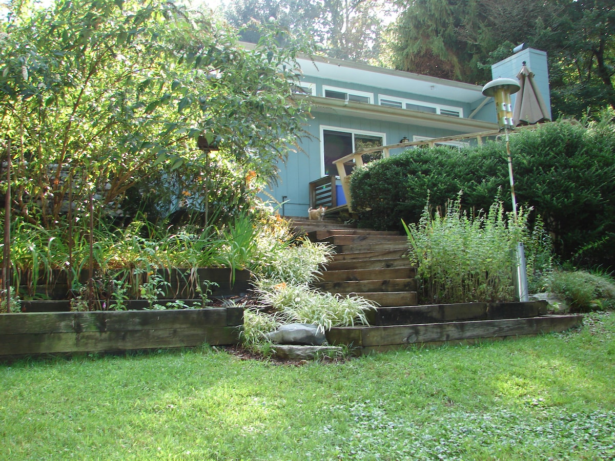 Secluded mountain escape with blazing fast WIFI (gigabit fiber optic). I've been personally building this studio for 2 years, and can’t wait to share my vision and hard work with you. The space is located up 16 stairs in the carriage house. It's about a mile from Hendersonville's Historic Main Street and yet secluded on 2 acres in wooded Laurel Park. A public park with a pond, stream, pathway adjoin the property. 30-minute drive to Pisgah & DuPont Forests.