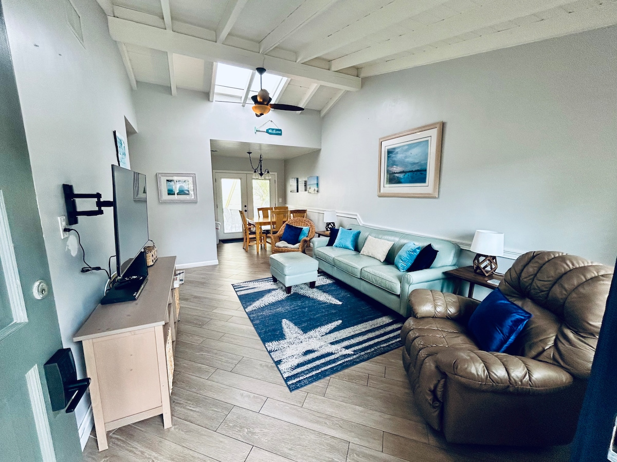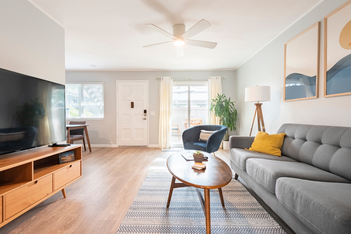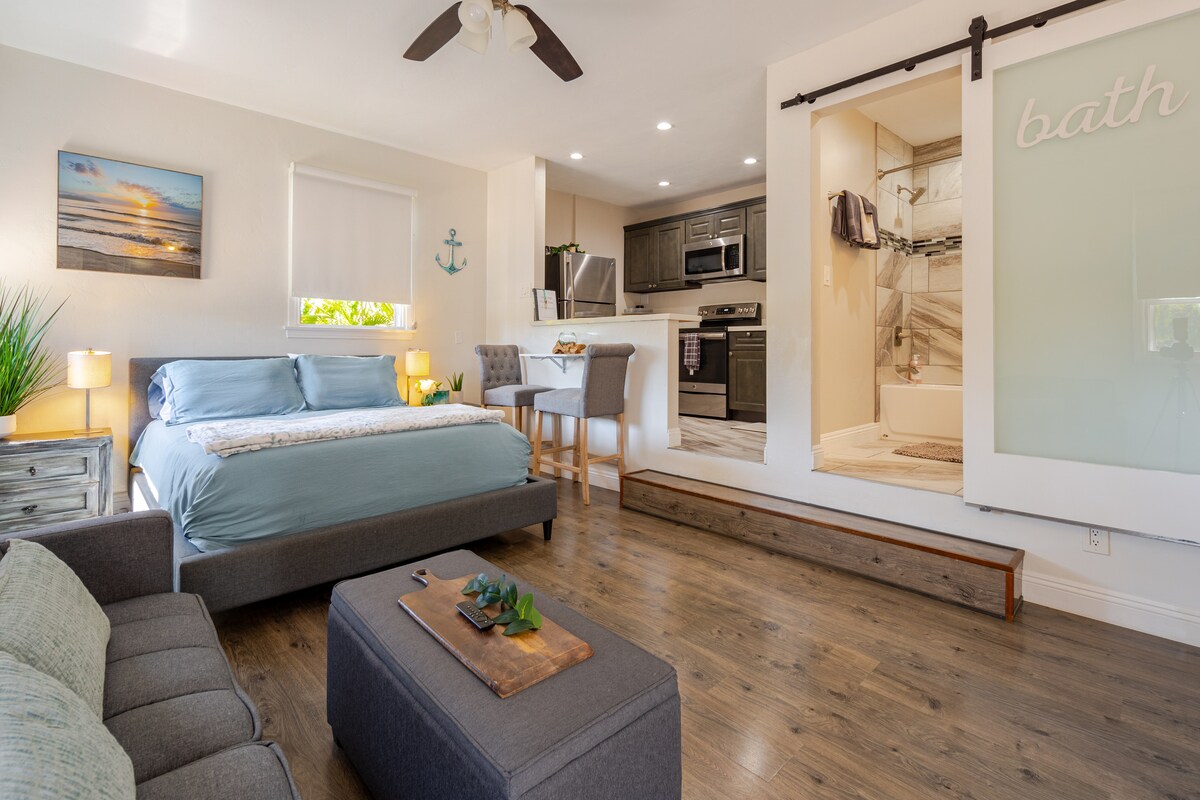 Stay, play, and explore from this sunny coastal studio, only steps from the beach and Carlsbad Village. The village is home to every imaginable type of retail store and restaurant, and it's only 5-10 minutes away! The studio has everything you'll need with a modern kitchen, AC, open living with a big comfy bed, and a sunny little patio to enjoy the endless Californian sun. Keep entertained with access to streaming apps on the smart TV, take a towel and lay on the sand or pack the surfboard to ca