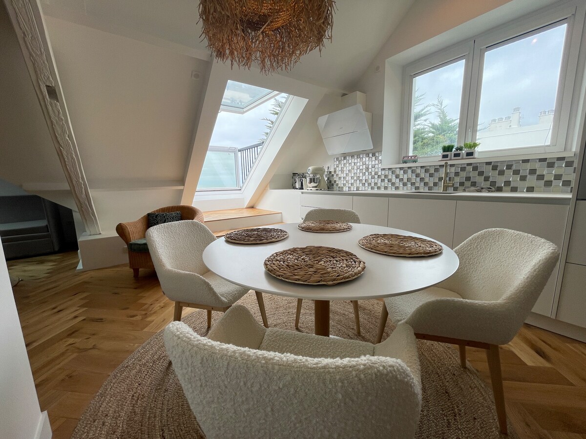 Möhtəşəm dəniz mənzərəli – Müstəsna mənzil Üst mərtəbədə yerləşən bu əzəmətli 55 m² okean sahili mənzil böyük L formalı terrasdan körfəzin 180° panoramik mənzərəsini təqdim edir. 🛋️ Parlaq məkan, dizayner dekorasiyası, tam təchiz olunmuş mətbəx, elektrikli 150-179 sm ölçülü çarpayısı olan sakit yataq otağı, böyük gəzinti duşu, ayrıca tualet. Pornichet qatar stansiyasından 🚶♂️ 15 dəqiqəlik məsafədə. Əhatə olunan parkinq, döşəkağılar və dəsmallar daxildir. Unudulmaz dənizkənarı qonaqlama üçün həqiqətən qəşəng və rahat bir yer.