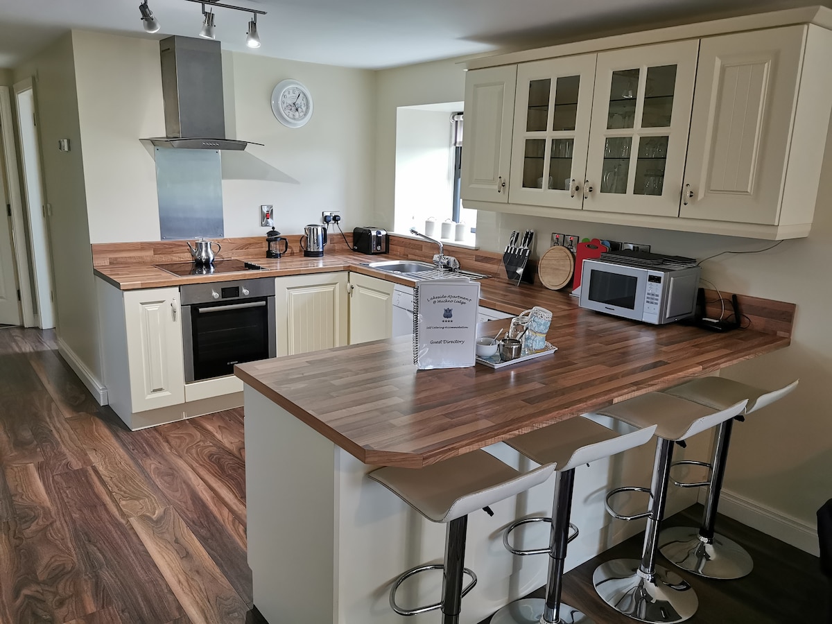 Lakeside Apartment @ Muckno Lodge 4 ulduzlu Failte İrlandiya tərəfindən təsdiqlənmiş Öz-özünə Yemək, 3 - 4 qonaq üçün rahat və lüks 1 yataq otağı bərpa edilmiş samanlıqdır, 1 yataq otağı 1 super yataq otağına və ya bir əkiz otağa (2 tək nəfərlik) uyğun gəlir. Qonaq otağında 1 böyük və ya 2 azyaşlı uşağın yata biləcəyi ikiqat divan çarpayımız da var. Göl kənarındakı mənzildə tam təchiz olunmuş mətbəxi olan tam yemək bişirmə imkanları var. Su kənarındakı mənzərələri seyr edərək Lough Muckno və Concra Wood Golf meydançasının yanında yerləşirik.